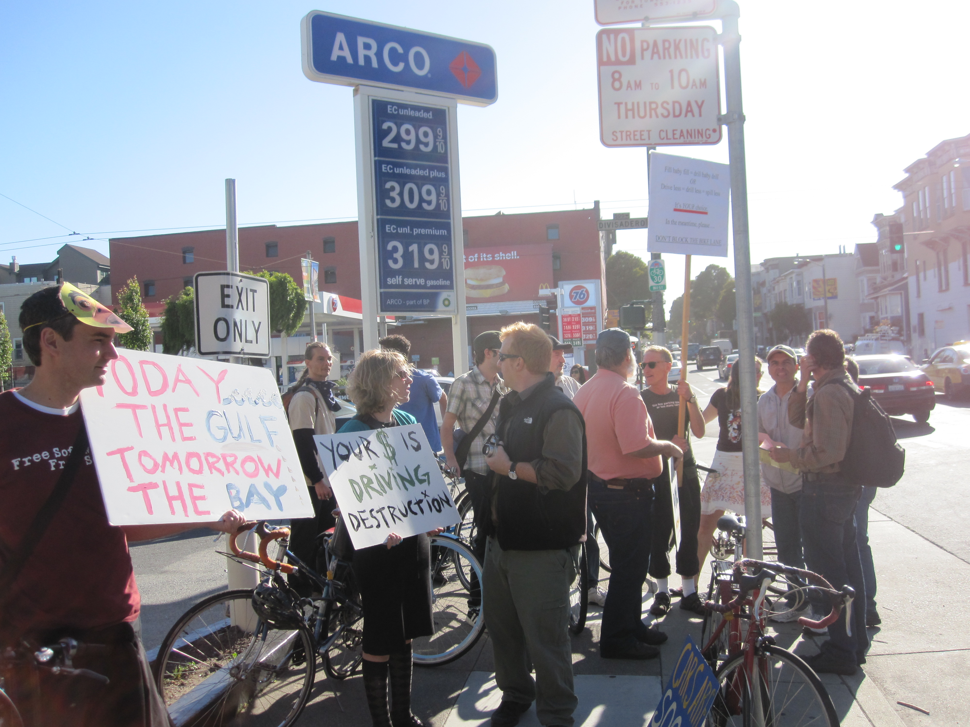 The protests by Fix Fell have occurred on seven consecutive Fridays and have garnered significant press coverage including in the New York Times. There have been two arrests and four citations of protestors, who have been peacefully blocking the Fell St. entrances to the Arco (BP) station to highlight the connection between unsafe conditions for cyclists and society’s addiction to oil, leading to the recent catastrophic Gulf oil spill.