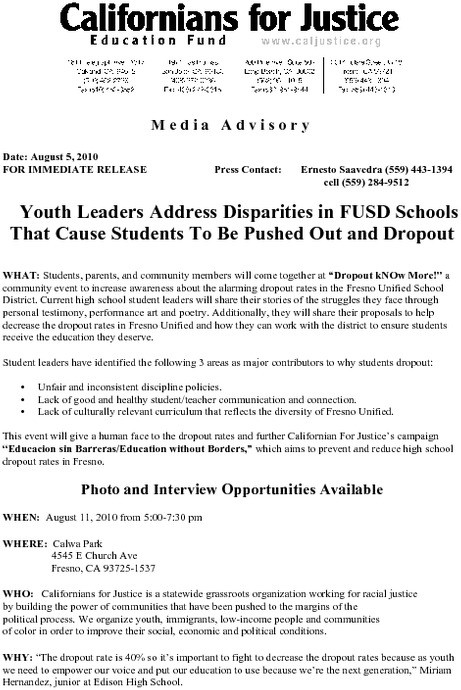 This event will give a human face to the dropout rates and further Californian For Justice’s campaign “Educacion sin Barreras/Education without Borders,” which aims to prevent and reduce high school dropout rates in Fresno.