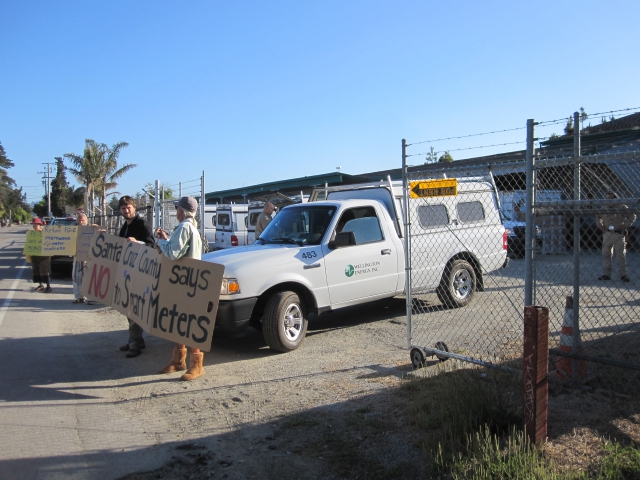 For the third straight morning, outraged Santa Cruz County residents gathered at the gates of Wellington Energy at 38th and Portola in Capitola, successfully blocking what they say is a forced installation of radiating ‘smart’ meters against the will of residents and nearly two dozen local governments throughout the Greater Bay Area. This morning, about two dozen protesters gathered at the gates of Wellington Energy, peacefully blocking the driveway as trucks started to drive out to install the ‘smart’ meters. The Santa Cruz County Sheriff showed up and asked the protesters to step aside. Once it was clear that protesters were willing to risk arrest, PG&E backed down in order to avoid any additional negative publicity that is increasingly plaguing their ‘smart’ meter program.