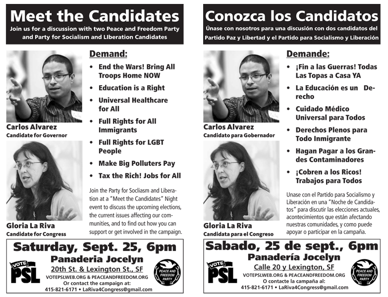 Join us for a discussion featuring PSL candidates Carlos Alverez for Governor and Gloria La Riva for Congress.