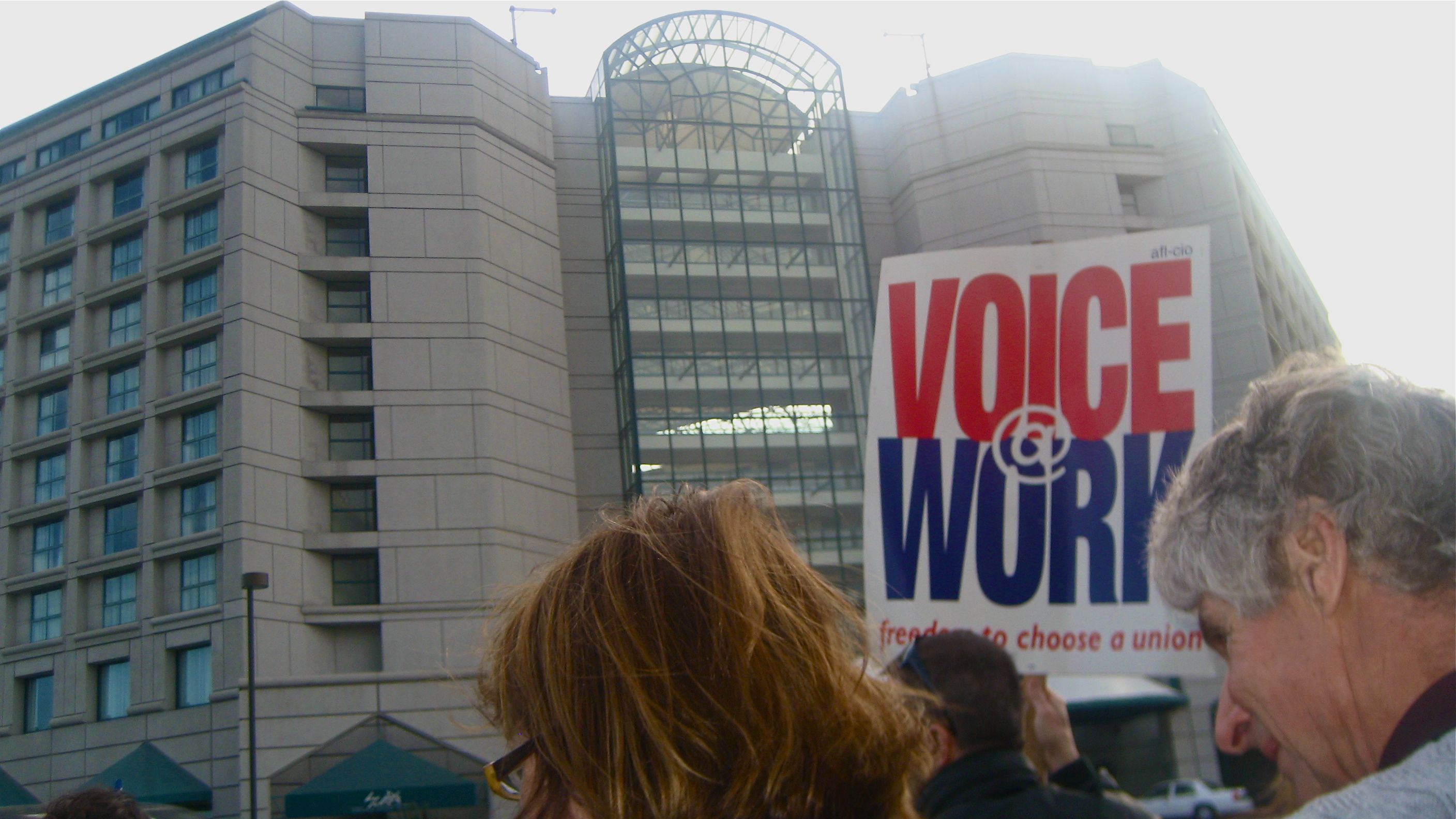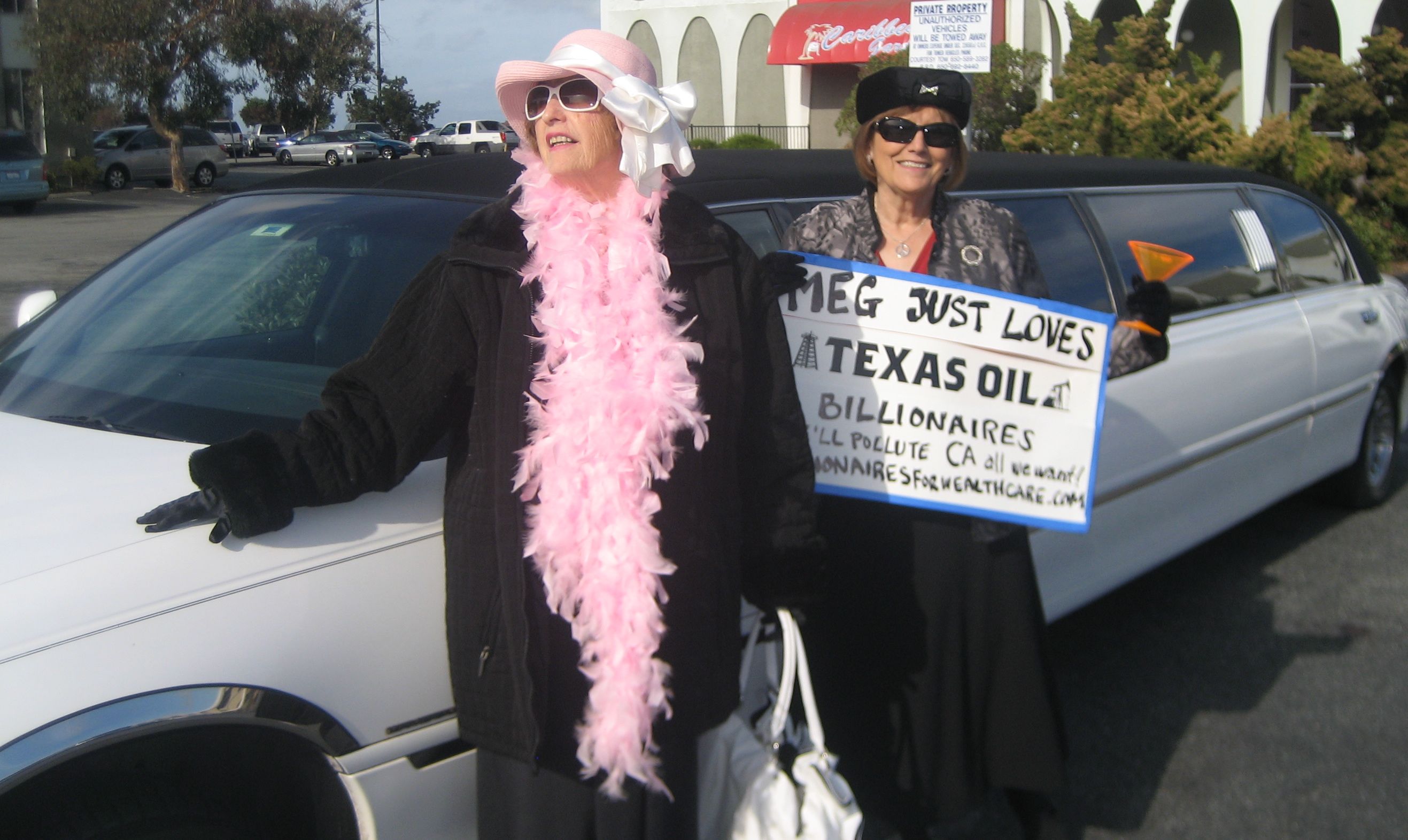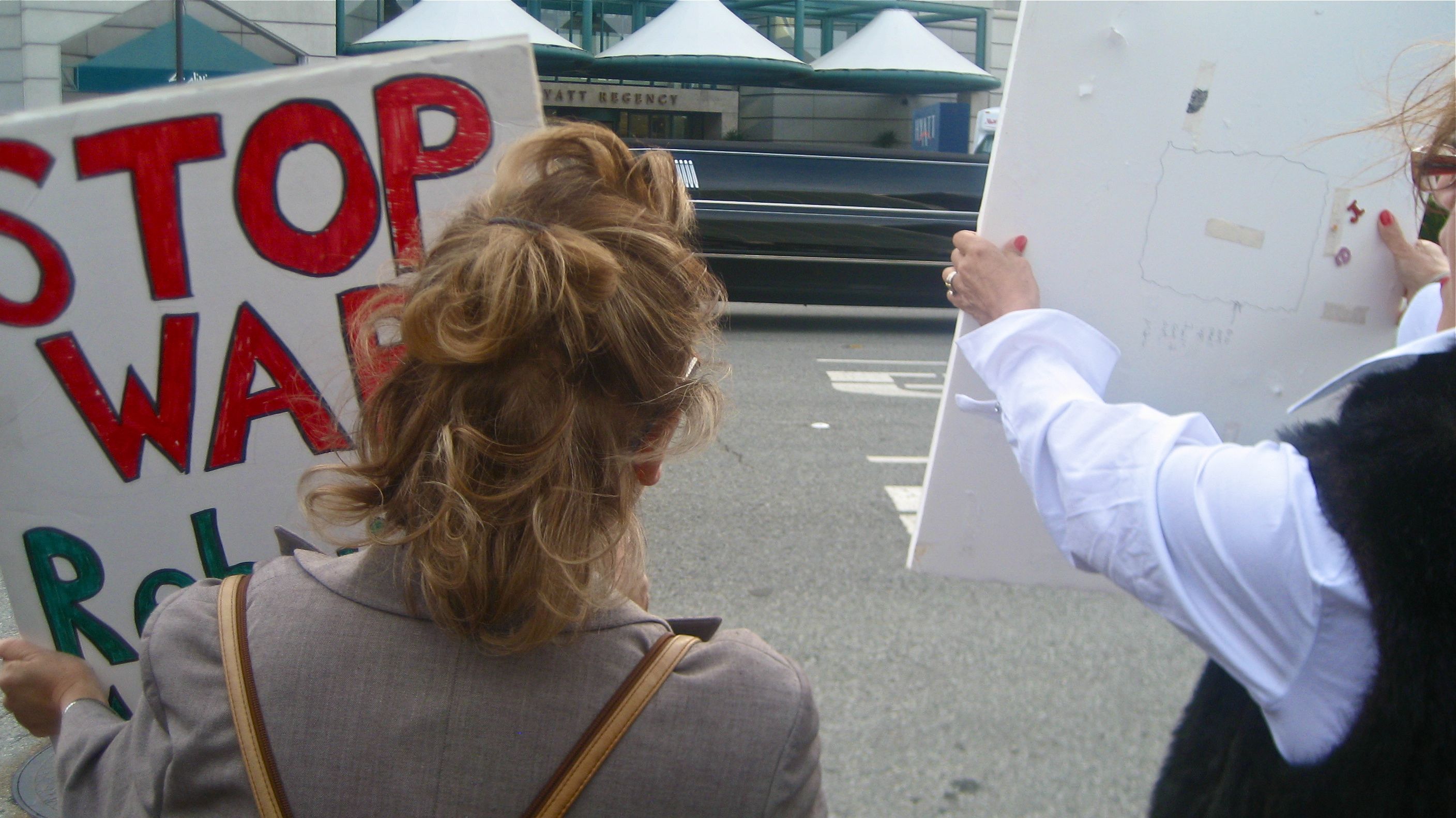 Voice at Work (AFL-CIO) and other unions were in front of the Hyatt Regency on Sept. 21. Nurses, teachers, heavy equipment operators, and healthcare workers, were among the crowd. A group called Billionaires for Wealthcare (some of their signs read "Oil Billionaires for Meg") created a bit of a ruckus when they were seen standing by a limo. Some of the protesters mistook them for genuine Republicans, until they saw their campy signs, including "Meg loves Polluters".