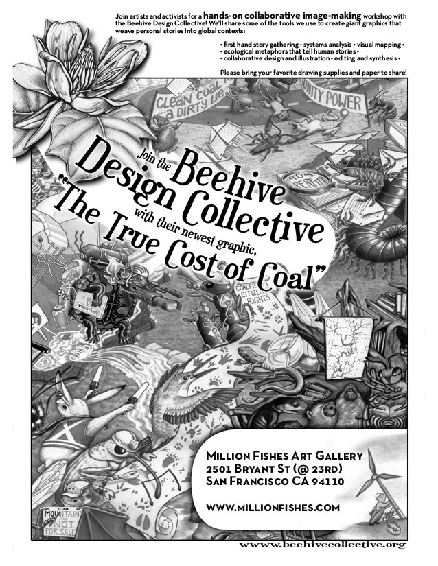 Join artists and activists for a hands-on collaborative image making workshop with the Beehive Design Collective! We'll share some of the tools we use to create giant graphics that weave personal stories into global contexts: