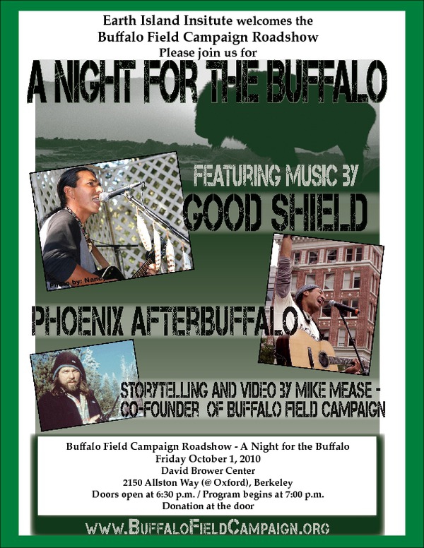 Roadshow event will include videos and updates from the field: Learn about the campaign to stop the slaughter of Yellowstone's wild buffalo herd from BFC co-founder Mike Mease. Amazing Native American musicians Phoenix After Buffalo and Good Shield will play sets. Door Open at 6:30.