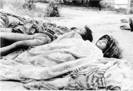 including 13 babies...The military had dropped leaflets warning civilians to seek refuge in temples and churches to