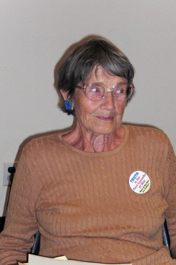 Clark introduced herself as Peace and Freedom’s 50th District Congressional candidate against Republican incumbent Brian Bilbray (who won a special election after the district’s previous Congressmember, Randy “Duke” Cunningham, was forced out of office when he was convicted of accepting bribes from defense contractors) and Democratic challenger Francine Busby. “Francine Busby is a nice woman, but [if she’s elected] she’s going to have to go along with the war,” Clark said, “This is a bipartisan war.” Clark joked that this is the third consecutive election in which she’s run for the seat — and so little has really changed in American politics in the last four years, despite the Democrats winning the presidency and a Congressional majority, she said that she can still use the issue cards she had printed in 2006.