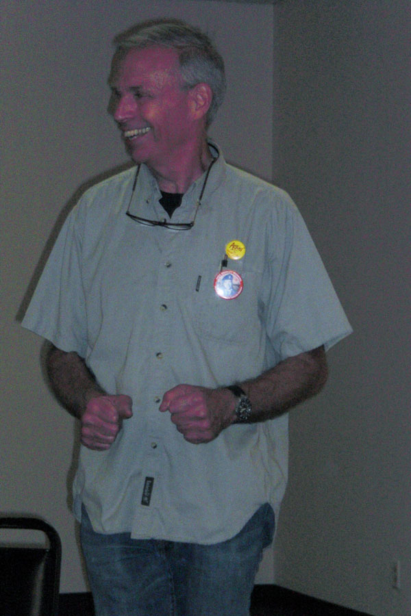 Local activist Fred Lonidier mentioned another type of organization he’s been involved in: the Labor Party. Noting that the U.S. doesn’t have a parliamentary system, which has allowed Green Parties in other countries to claim a share of power in government, he said the Labor Party was a project of the late union leader Tony Mazzochi “to win the labor movement over to a labor party” and “to resolve the structural impediments to [alternative] parties in the U.S.” Arguing that electing Democrats is crucial to the labor movement because Republicans have become so aggressively opposed to workers’ rights to organize that they fill the labor boards with appointees that routinely rule against unions, Lonidier said, “The Labor Party decided only to contest elections where there was a good chance of winning.” He also complained that the Peace and Freedom Party had kept local progressive Democrat Dan Kripke from winning a Congressional election by splitting the progressive vote and thereby allowing his incumbent Republican opponent to stay in office.