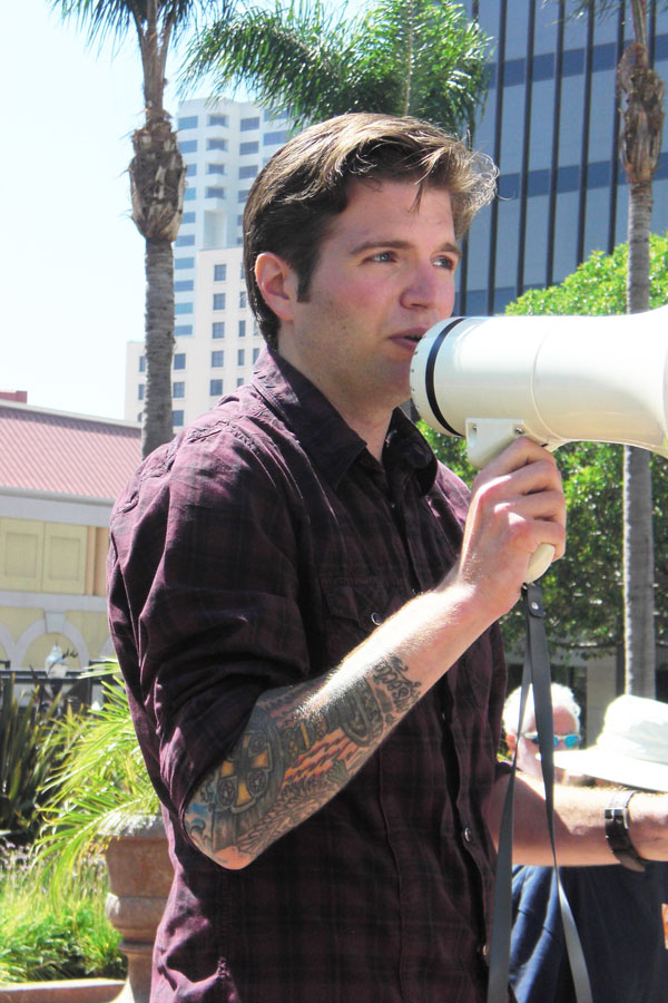 Michael Anderson, who helped organize the rally on behalf of at least two of the sponsoring organizations, Activist San Diego and the San Diego Alliance for Marriage Equality (SAME), kicked off the event by reading the letter and MC’d it throughout. The rally took place on Sunday afternoon, September 19, in front of the Horton Plaza shopping mall at Fourth and Broadway downtown. Speakers — most of them using a bullhorn since the P.A. system malfunctioned early on — delivered impassioned pleas not only for Manning but urging increased resistance to the wars in Afghanistan and Iraq. Lorraine Wrightsman of the Bradley Manning Support Network said her group has raised over $50,000 for Manning’s legal defense and boasted that “due to sites like WikiLeaks, transparency is coming” — that government can no longer keep anti-civilian attacks like the one documented in “Collateral Murder” secret.