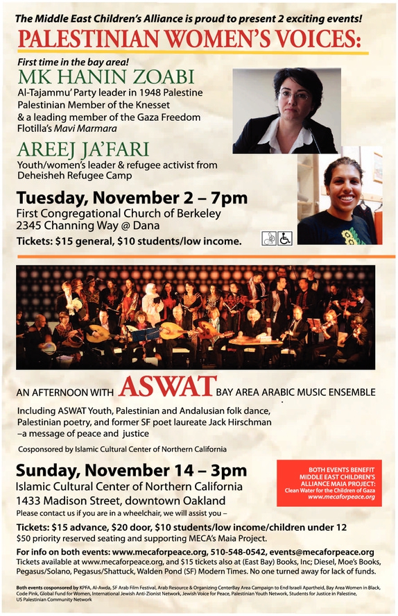 Cosponsored by KPFA, Al-Awda, SF Arab Film Festival, Arab Resource and Organizing Center, Bay Area Campaign to End Israeli Apartheid, Bay Area Women in Black, Code Pink, Global Fund for Women, International Jewish Anti-Zionist Network, Jewish Voice for Peace, Palestinian Youth Network, Students for Justice in Palestine, US Palestinian Community Network