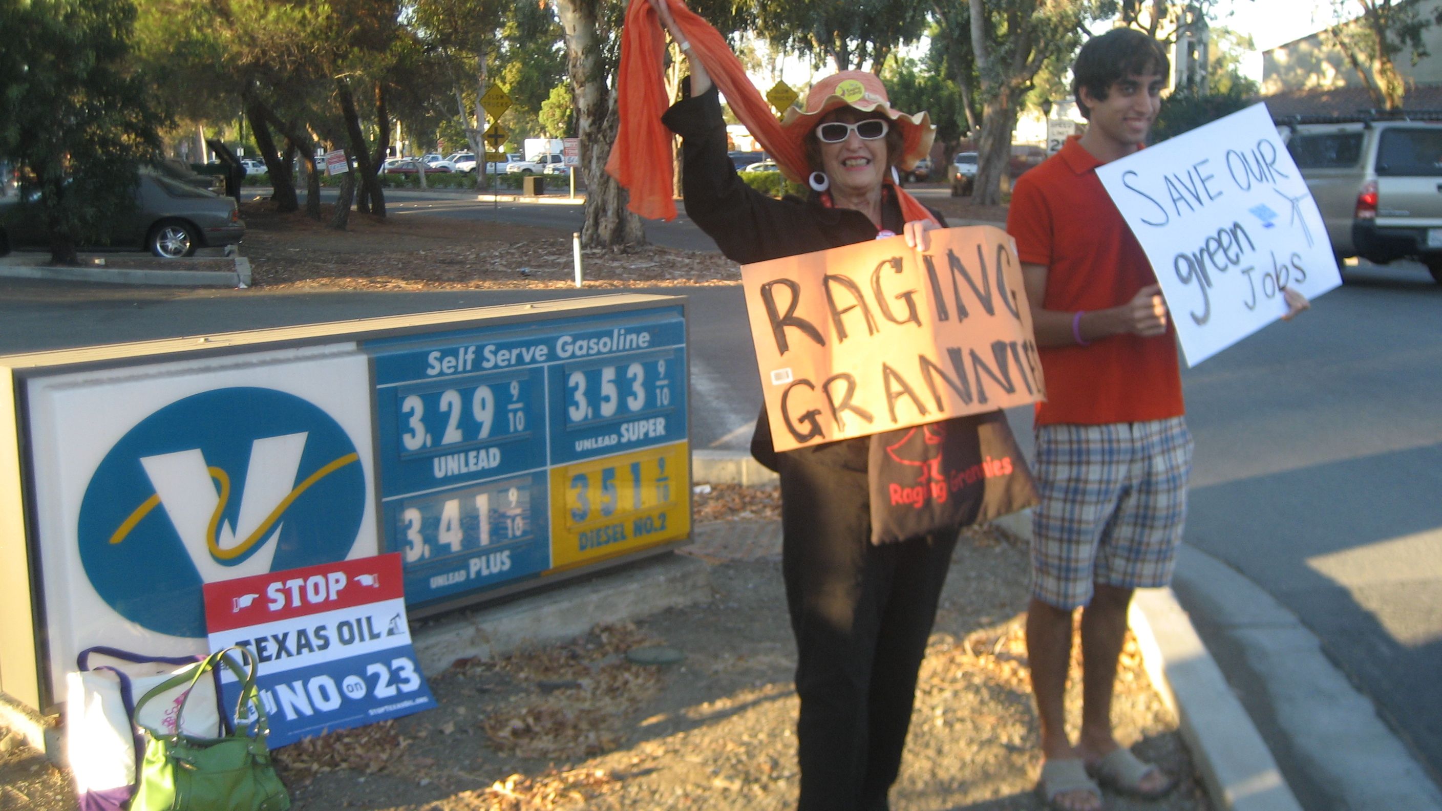 Texas oil companies Valero and Tesoro are major financial contributors to Proposition 23 and that is why the students are choosing to demonstrate every Friday until the election, from 5 to 6 pm., in front of the Valero gas station on Stanford's campus. At today's demonstration, students were joined by members of the Raging Grannies, local environmental activists who like to come in costume and with props. The next demo will be on Friday October 22nd; one of the "Grannies" said they will be unveiling a new bit of street entertainment at the 4 way stop in front of the Valero.