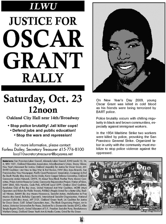 Angered by the pro-police rallies and news coverage calling for killer cop Mehserle’s freedom, Local 10 of the International Longshore and Warehouse Union has called for a labor and community rally October 23rd in Oakland to demand justice for Oscar Grant and the jailing of killer cops. Bay Area ports will shut down that day to stand with the black community and others against the scourge of police brutality.