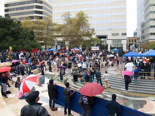 On October 23rd, the ILWU Local 10 longshore workers closed all bay area ports (Richmond, Benicia, Redwood City, Oakland and San Francisco) and rallied in Oakland's Frank Ogawa Plaza to protest the murder of Oscar Grant with the demand "Justice for Oscar Grant! Jail Killer Cops!" ILWU union port workers joined the rally which brought together many organizations, including labor unions, high school and college students, the faith-based community and the general public in a call for justice.