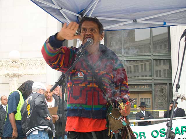 Pictured above: Zachary Runningwolf burns sage while opening the Justice for Oscar Grant rally in Oakland's Frank Ogawa Plaza.