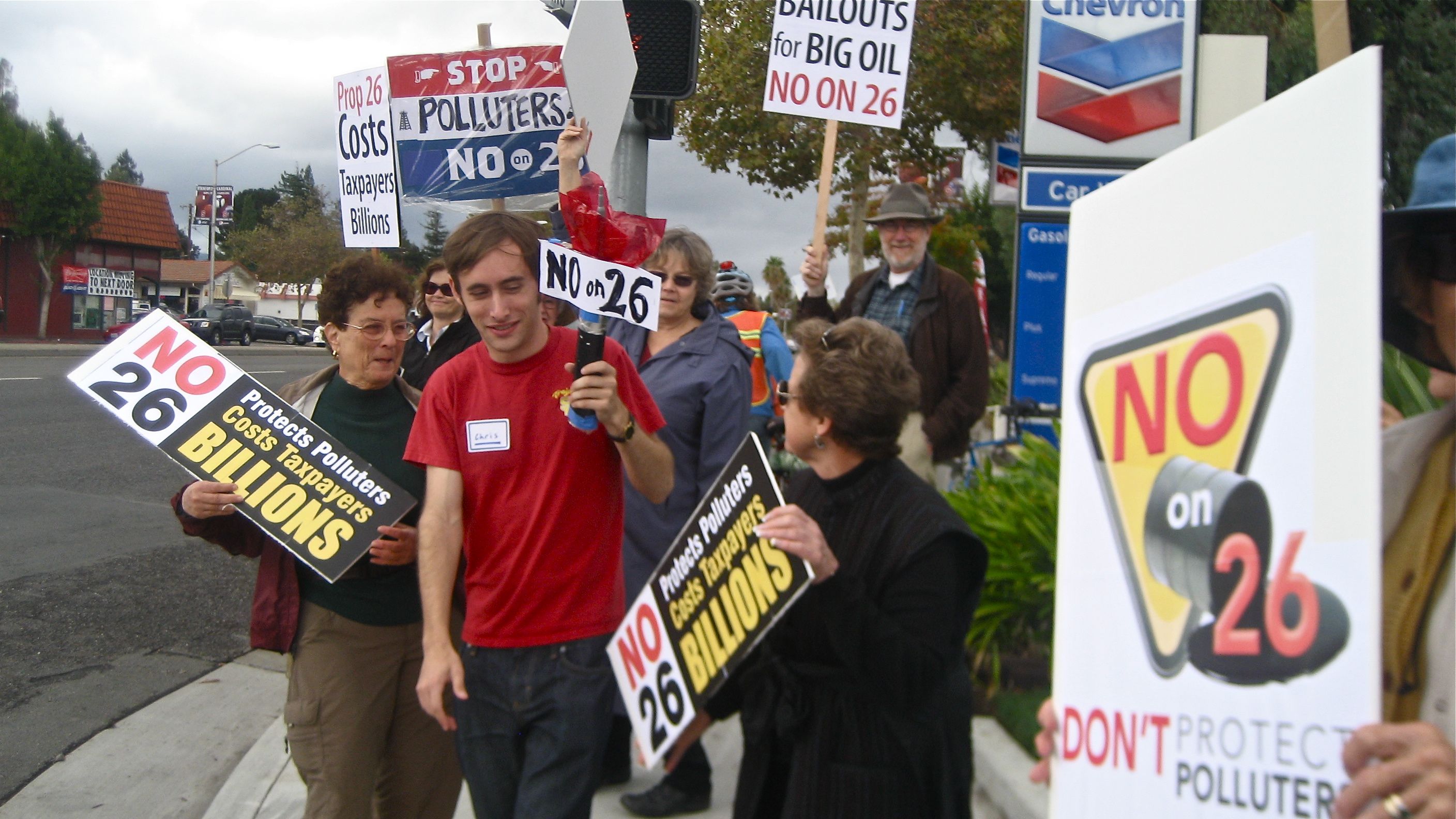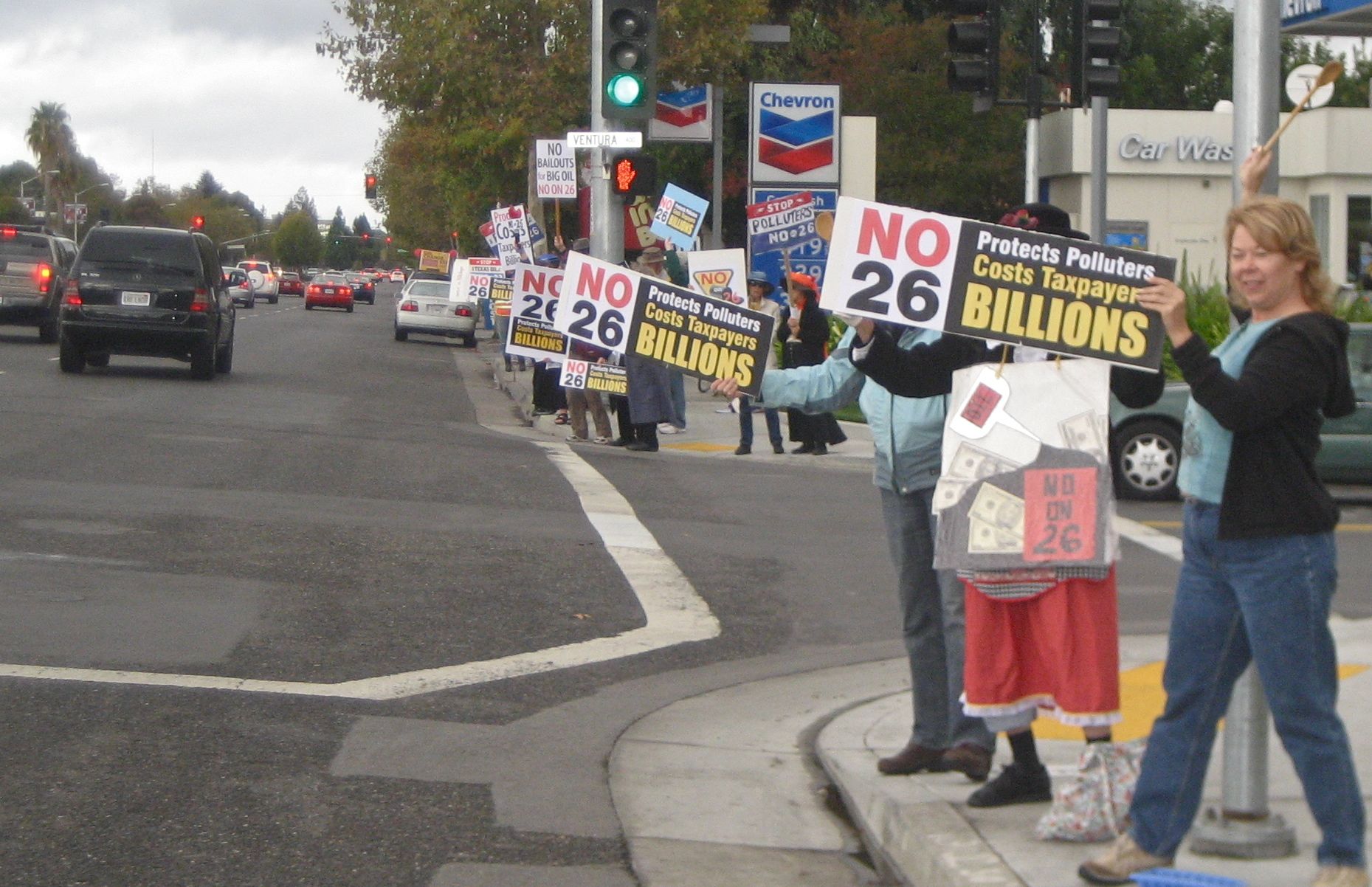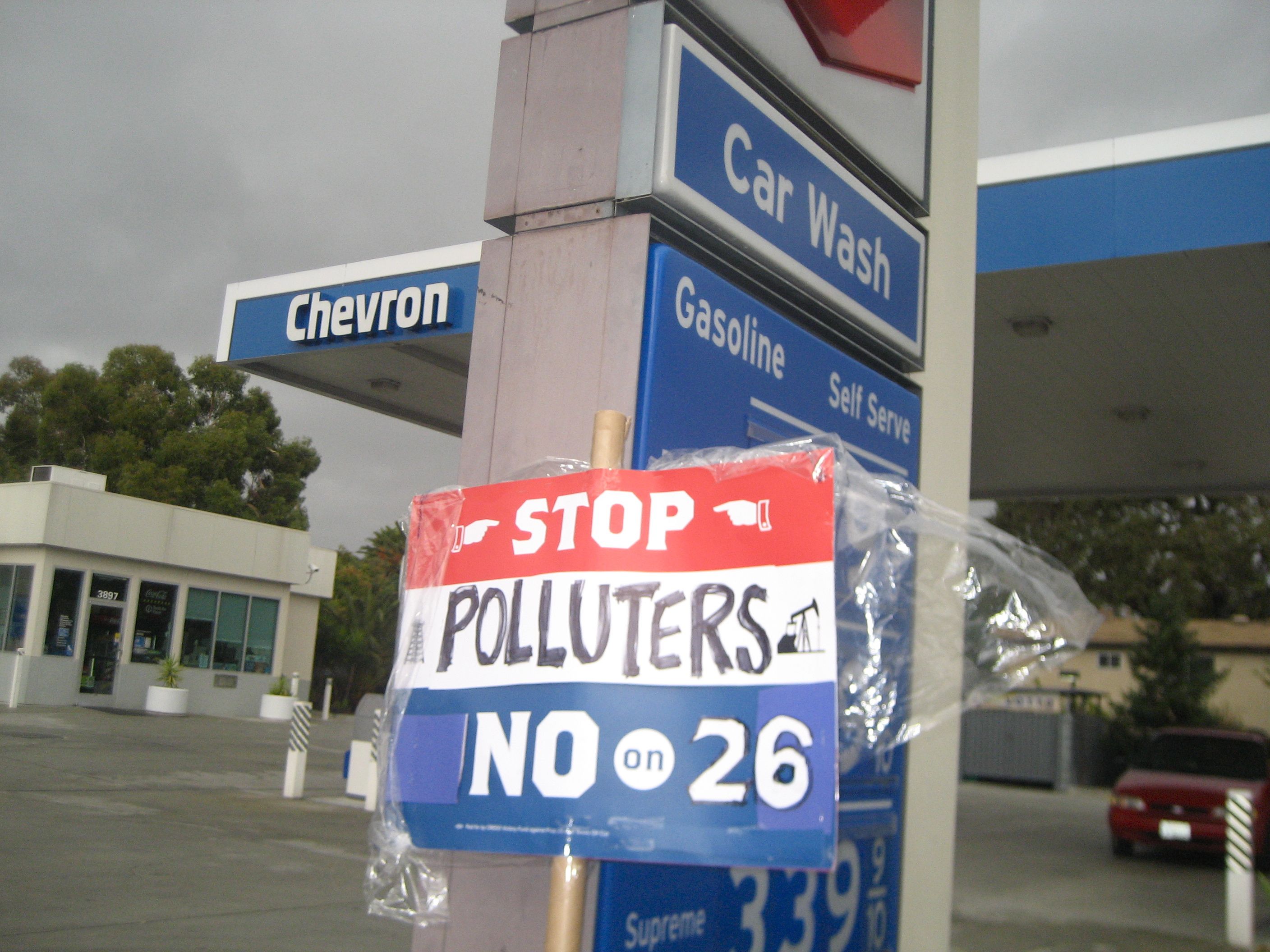 Chevron gas stations in 5 California cities were the site of demonstrations today as Sierra Club members and allies hit the streets to say No on Proposition 26. Chevron was the target of demonstrations because they are the number one top contributor to this corporate self-serving initiative. In recent weeks, Chevron has tried to "greenwash" its image with a campaign they call "We Agree". In the campaign, Chevron uses photos of attractive models to misdirect public perception of the company. Chevron is trying desperately to appear as if they are interested in helping communities in the US and foreign countries. Their backing of Proposition 26 reveals a different story.