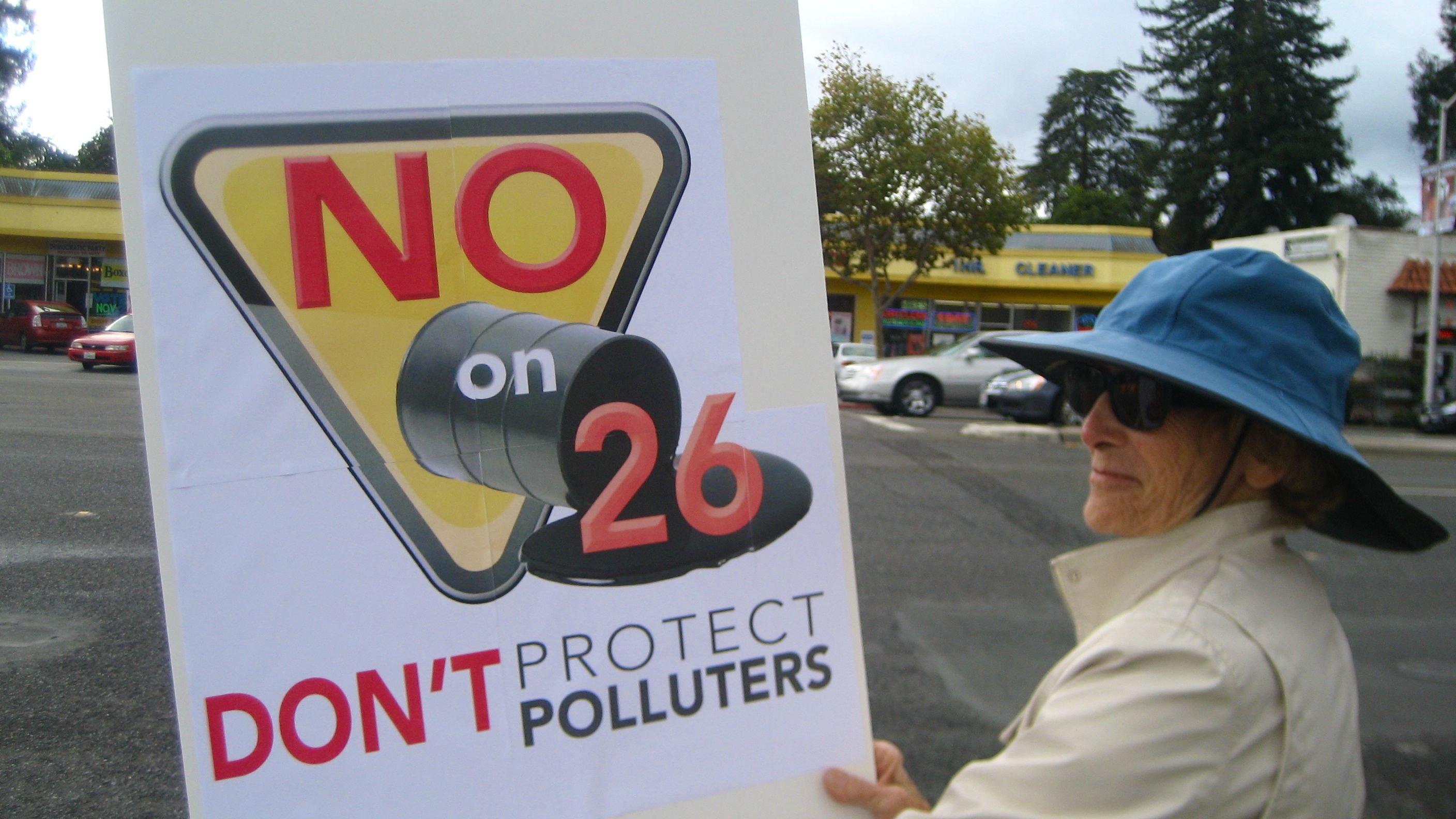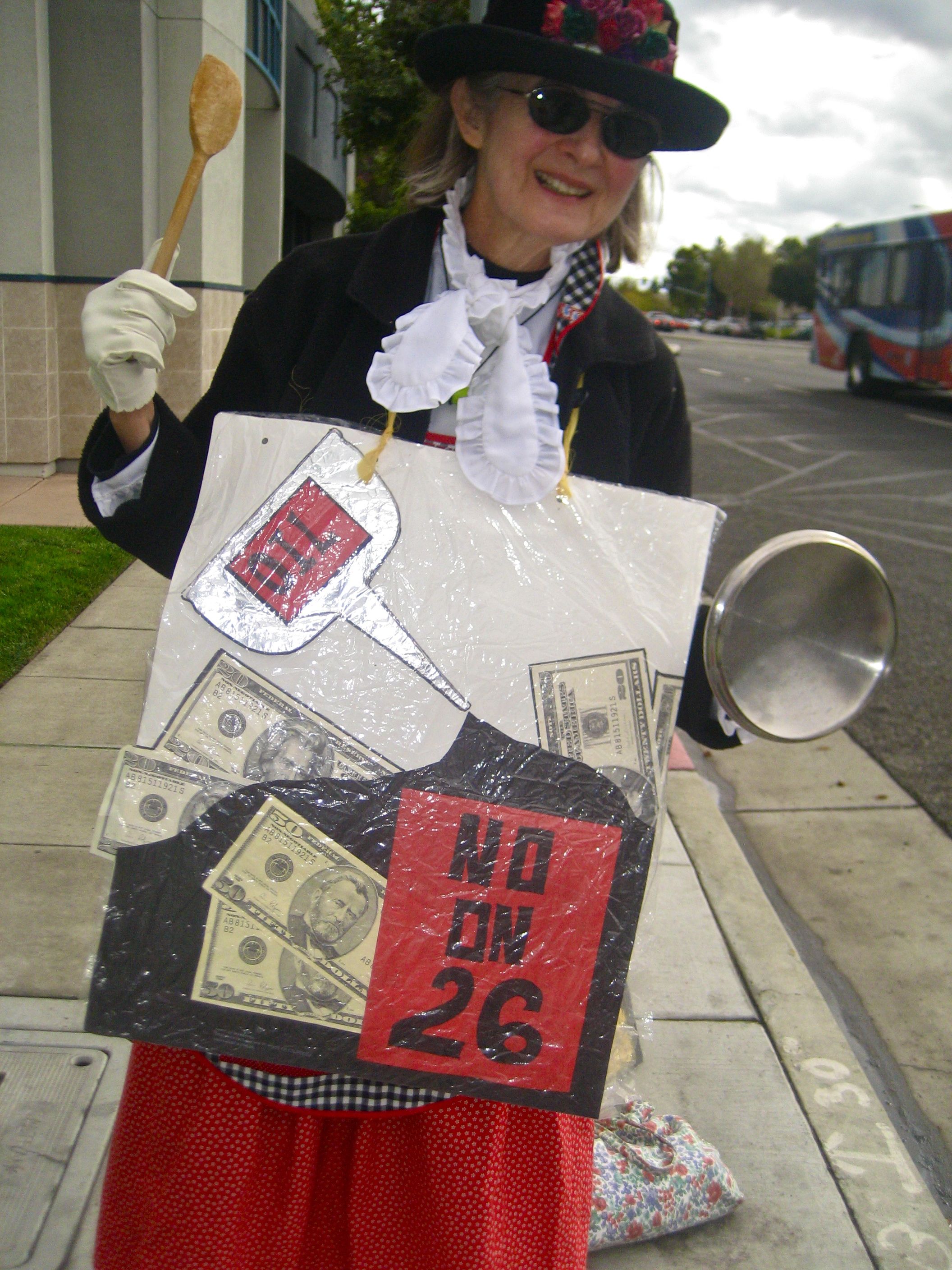 In Palo Alto, Sierra Club members and environmentalists including the Raging Grannies held No on 26 signs on a busy street corner. They said they hoped to influence people who have not yet voted to reject the proposition.