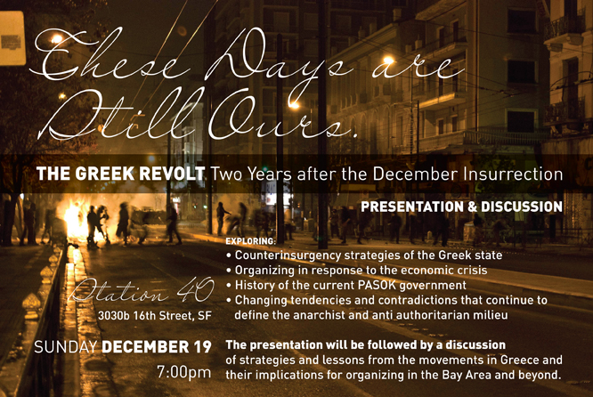 Join Tim, just back from Greece, to explore topics such as the counterinsurgency strategies of the Greek state, organizing in response to the economic crisis, the history of the current PASOK democratic socialist government, and the changing tendencies and contradictions that continue to define the anarchist and antiauthoritarian milieu.