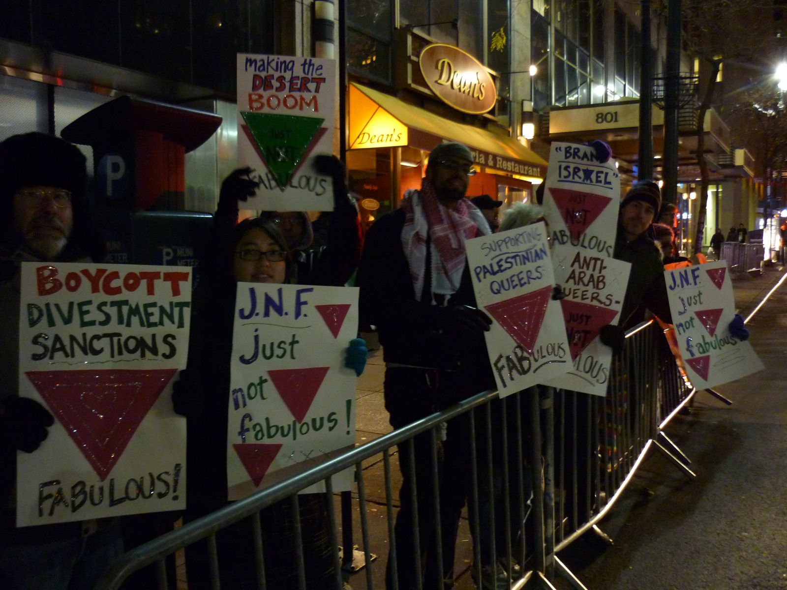 Protesters held a rainbow banner saying, “Jewish National Fund: Just Not Fabulous” and sparkly signs reading “Using Queers to Oppress Palestinians: Just Not Fabulous,” “Supporting Palestinian Queers: Fabulous,” “Making the Desert Boom: Just Not Fabulous,” and “Boycott, Divestment and Sanctions: Fabulous.” They loudly reminded the ill-advised attendees that driving people from their houses at gunpoint, demolishing their homes, and then planting trees on the rubble has been considered a Don't since at least 587 BCE, when it got the Babylonians no end of bad press. Protesters chanted, “Fags, trannies, gays and bi’s, Queers say not to JNF lies!” and "High femmes are super fine! Israel out of Palestine!"