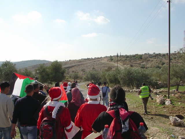 On December 24th, 2010, Palestinians, along with a small number of Israelis and internationals, marched out of the village of Bil'in in the West Bank to protest the Israeli apartheid wall. This weekly Friday demonstration has occurred since 2005, organized by the Popular Struggle Coordination Committee. Being Christmas Eve, the protest this Friday featured several Santas who tossed out candies to children as the demonstration began in the center of the village and then rang bells throughout the march to the wall. This week, the bulk of the march made it to the wall before Israeli Defense Forces began dispersing noxious tear gas and stun grenades. Shortly thereafter soldiers made their way through the fence and slowly advanced toward the edge of Bil'in, threatening the use of rubber bullets several times as they moved forward.