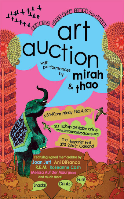 Join us for a special evening of art, music, memorabilia and fun! Bay Area Girls Rock Camp will auction off a diverse collection of art from Bay Area artists, as well as signed memorabilia from musicians, including: a Runaway’s t-shirt and LP package signed by Joan Jett, an Alvarez acoustic guitar with hand-drawn art by Ani DiFranco, postcards signed by R.E.M., handwritten lyrics by Roseanne Cash, artwork by Melissa Auf Der Maur (Bassist from Hole), and more! An online auction will begin on Saturday, January 29th for the signed memorabilia items, and will end at the event. In addition, special guests Thao (Thao with the Get Down Stay Down) and Mirah and Friends will provide an intimate live performance.
