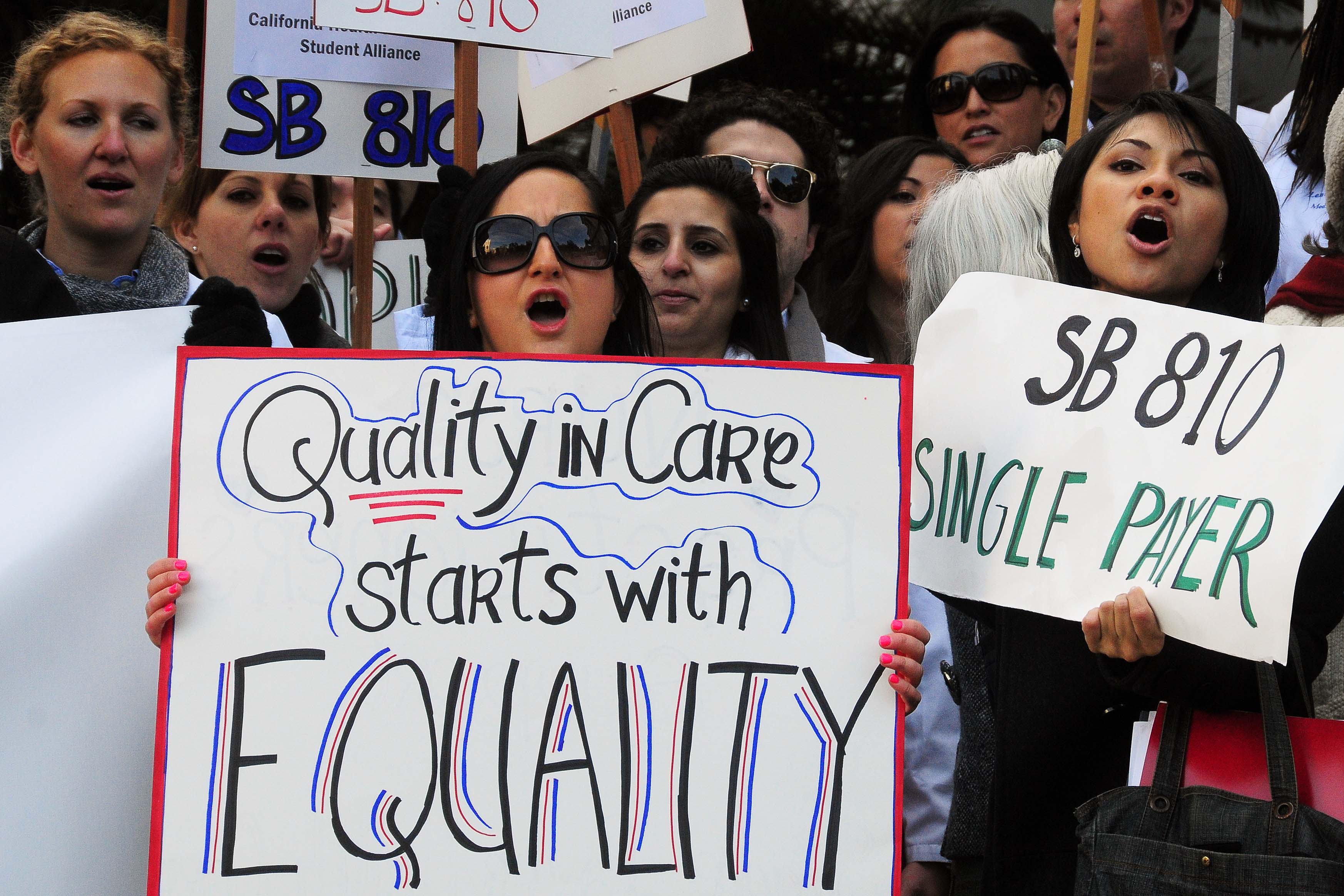 After the press conference, Single Payer Now and the California Healthcare Professional Student Alliance (CAHPSA) launched a kick off rally for the California Universal Healthcare Act, CA Senate Bill 810 (SB810). The keynote speaker of the rally was SB810’s author, Senator Mark Leno. Other speakers included healthcare providers and students, who spoke on the critical need of a single-payer healthcare system, a system that would guarantee healthcare for all Californians by elimating the multi-billion dollar parasitic insurance industry. Hundreds of healthcare students and single payer supporters held placards that read “Healthcare Yes! Insurance Companies No!”