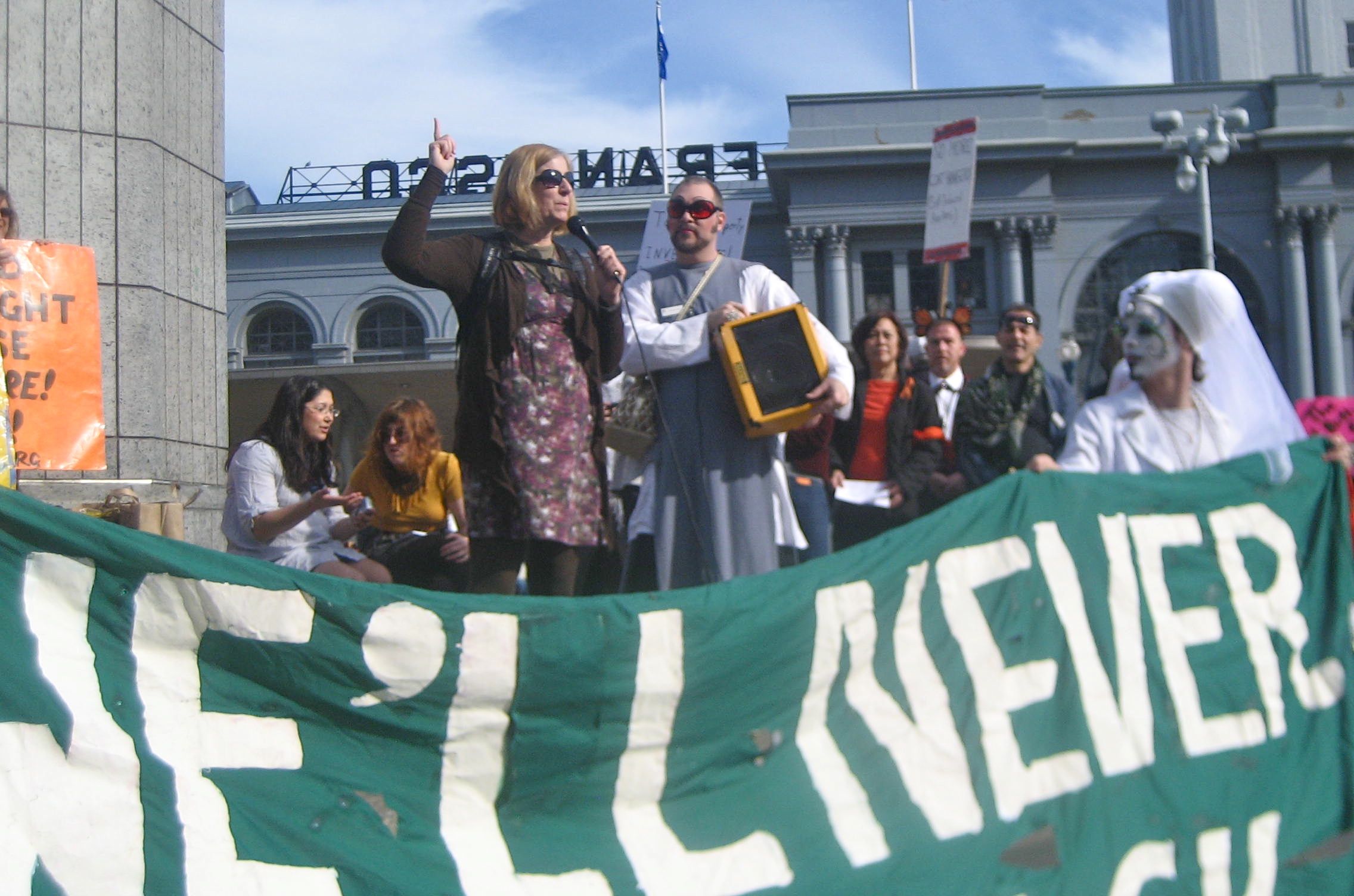 The Sisters of Perpetual Indulgence, the Raging Grannies, Bay Area Coalition for our Reproductive Rights (BACORR), Radical Women, World Can't Wait, and other groups participated in the pro-choice activities of the day. Cindy Sheehan, amongst others, addressed the crowd of about 100 people at a rally and many more joined the march for choice.