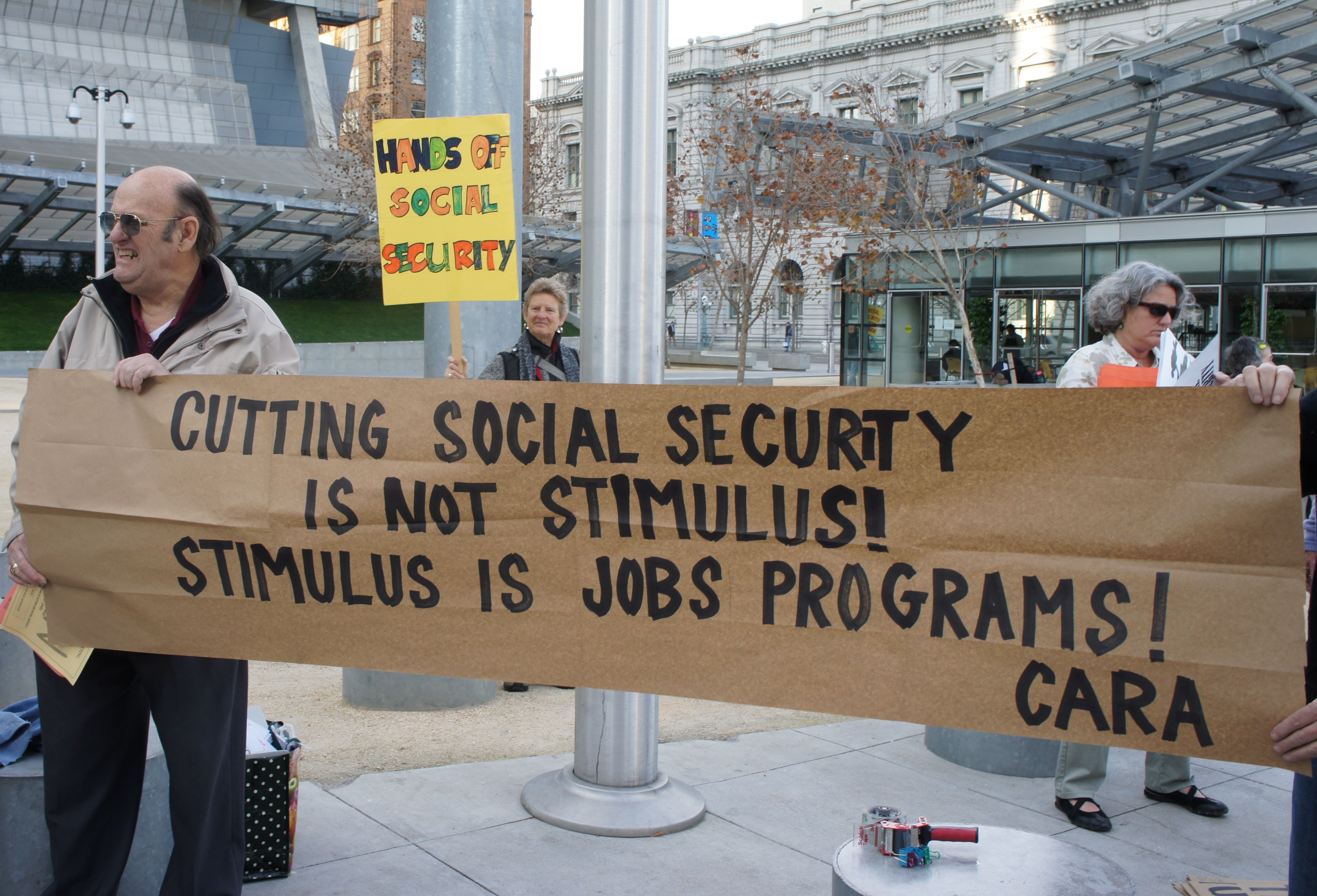 Young workers at today's rally explained why tax cuts for corporations and wealthy individuals do not generate jobs, and said major jobs programs are necessary. A banner put the message succinctly: Cutting Social Security Is NOT a Stimulus...Creating Jobs Programs IS a Stimulus.