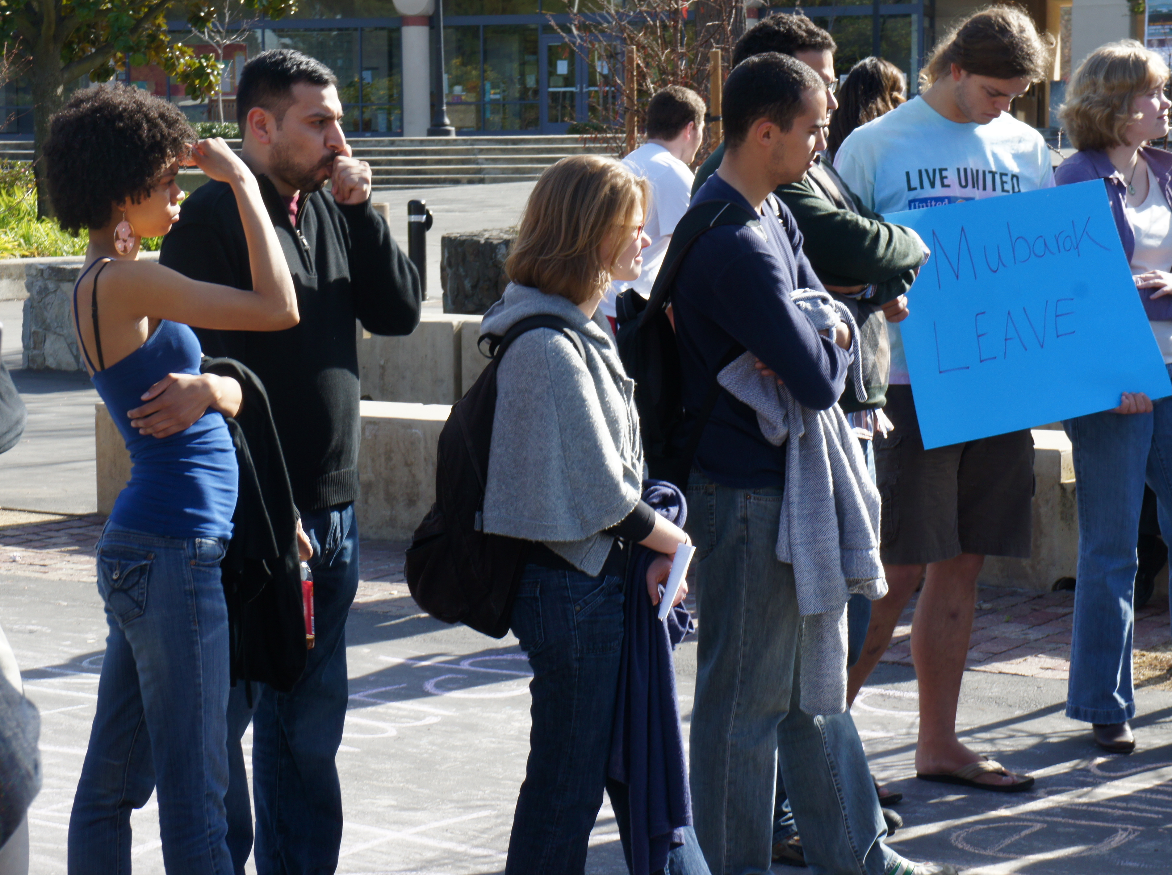 Students, staff, and community members talking amongst themselves after the demonstration said they are happy that Egyptians have stood up to Hosni Mubarak's repressive regime and are demanding their human rights.