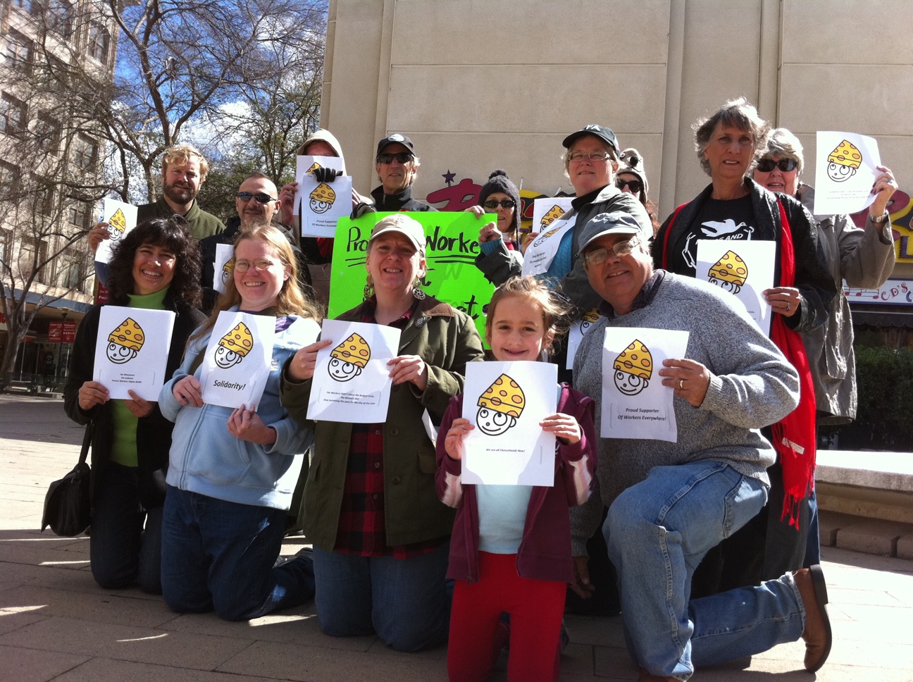On Saturday, Feb. 26, during the national day of actions in support of workers, a small but enthused mix of of folks in Fresno stood in spontaneous and impromptu solidarity with the people in Wisconsin. Choosing the Fulton Mall's Free Speech platform as their gathering site, the link between today's world events and that great struggle by the Industrial Workers of the World commemorated at that very plaza was clear. The group represented a variety of perspectives and backgrounds. Participants spoke about the need to stand with Wisconsin, pointing out that it is not the unions, not the workers, not the public sector employees who have caused this budget crisis. Some spoke about the power and importance of labor in protecting and bettering conditions in society. One Fresno teacher noted, for example, that in every right to work state education quality is lowest, in states with strong teachers union, education quality is highest. Another participant spoke about the need for reform that would reign in the power of corporations, about the growing inequality in the society, about the need to tax the corporations and wealthy. For example, they noted a major tax cut to corporations in Wisconsin was granted by the same Republicans who now make public workers the scapegoats, and that this decline in revenues, not increased worker cost, has caused much of Wisconsin's current fiscal woes. The same speaker noted that the CEOs of Americas richest companies now make some 300 times the average worker, far outstripping the CEOs of similar industrialized countries. Another rally member said she had heard the figure was 500 times. A retired worker spoke of the need for Unions to stand firmer and stronger against cuts in workers rights. She noted her health care, free at the start of her retirement, has gone up in cost three times, while her company CEO's income has gone up by millions. The costs of wars and the military machine also entered the conversation as a natural place where money could be found for improving infrastructure and helping those in need. Still others at the event called for more radical and systemic changes, asserting the need for a world that was controlled by people and cooperation, not corpoations or profit, a world free of classes and exploitation. Standing across differences, the group stood in solidarity both with the workers of Fresno, and the workers of the world. We are all cheeseheads now!
