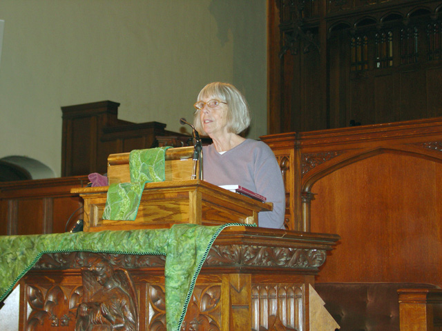 Jack Shriver, interim pastor of First Presbyterian Church of Oakland, opens the evening by recounting a trip he made to Palestine to plant olive trees that he found eye-opening for his understanding of the realities there. Considering the Zionist demonstrators outside the event that night, he calls for civility within the church.