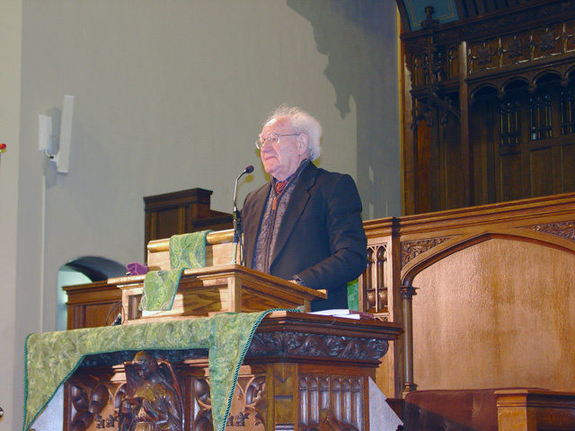 In commemoration of international Holocaust Remembrance Day 2011, the International Jewish Anti-Zionist Network, American Muslims for Palestine, and the Middle East Children's Alliance sponsored a 13-city speaking tour throughout the U.S. and Canada called "Never Again for Anyone" featuring Auschwitz survivor Dr. Hajo Meyer. During his appearance in Oakland on February 17th, Dr. Meyer was joined by UC Berkeley professor Dr. Hatem Bazian, chairman of the American Muslims for Palestine, and Sarah Kershnar of the International Jewish Anti-Zionist Network. The large church was filled to near-capacity with those wanting to hear the speakers. [Full audio in two parts below.]
