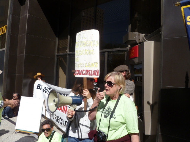 Oakland teachers who are members of Oakland Education Association as well as labor and community supporters joined together at the Wells Fargo bank in Oakland on April 4, 2011 to demand that the bank make up the deficit in the schools.