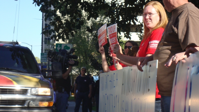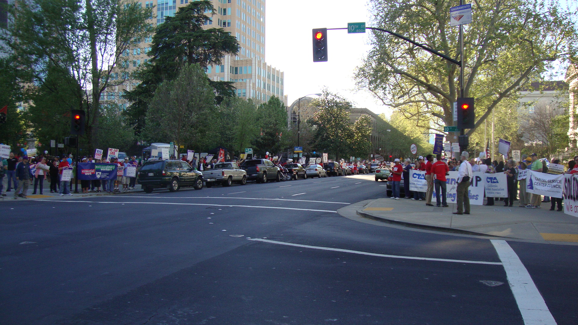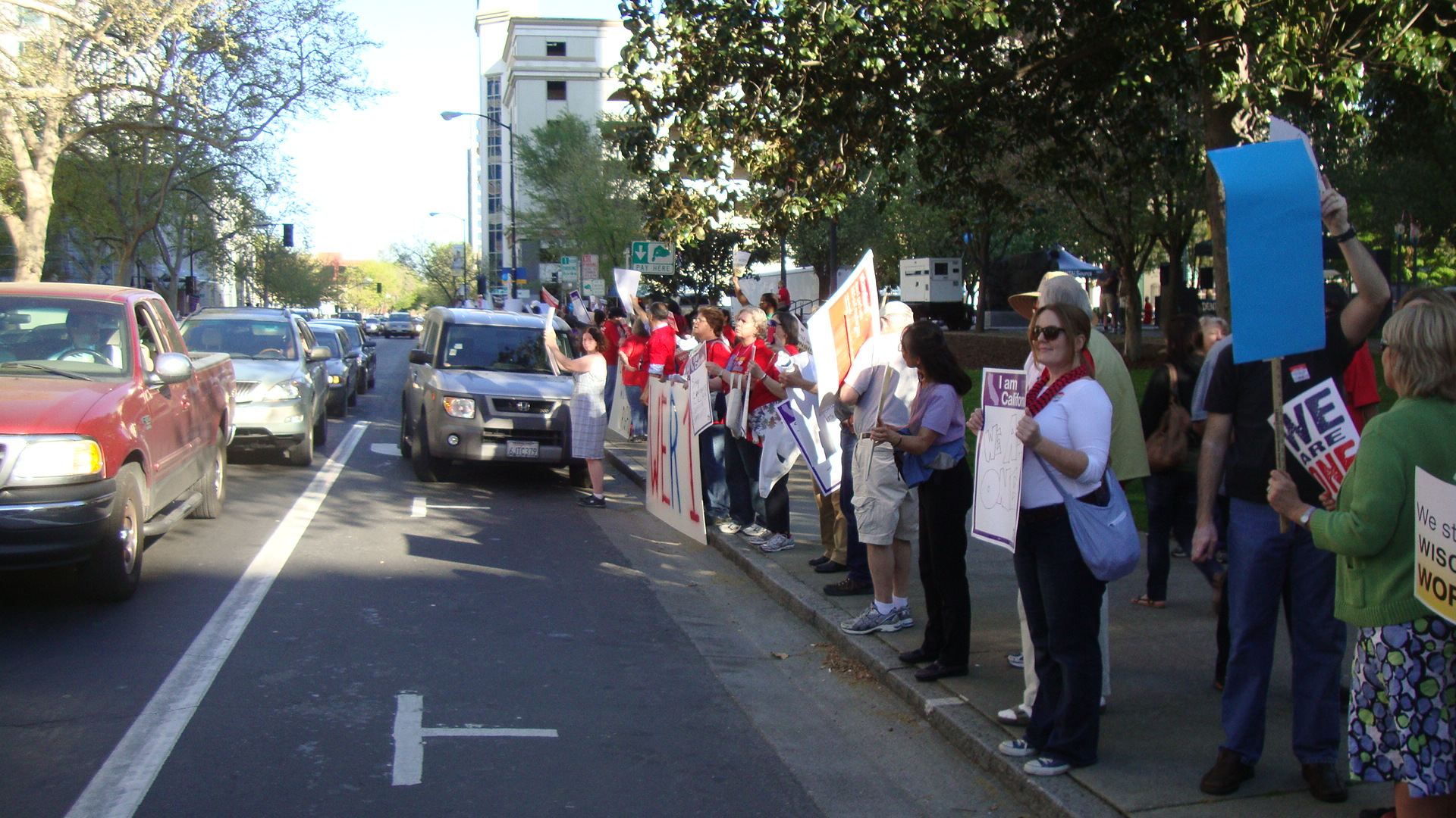 People lined both sides of I St. street for four blocks in front of Sacramento’s federal building, court house and jail. I St is also a main artery for a major freeway entrance which the rally slowed and jamed up 5:00pm commuter traffic.