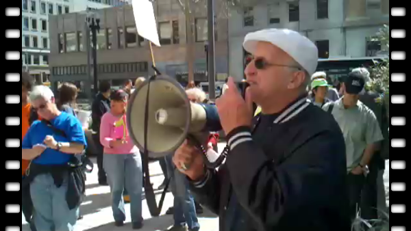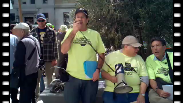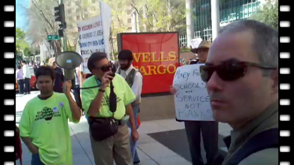 In the first video here, Bob Mandel of the Oakland Education Association (OEA) initiates the Wells Fargo action by quoting Martin Luther King Jr: "The purpose of our direct-action program is to create a situation so crisis-packed that it will inevitably open the door to negotiation." Before the action, he announces that Wells Fargo will be holding its annual shareholders' meeting on May 3rd in San Francisco where non-violent civil disobedience with arrests is expected.