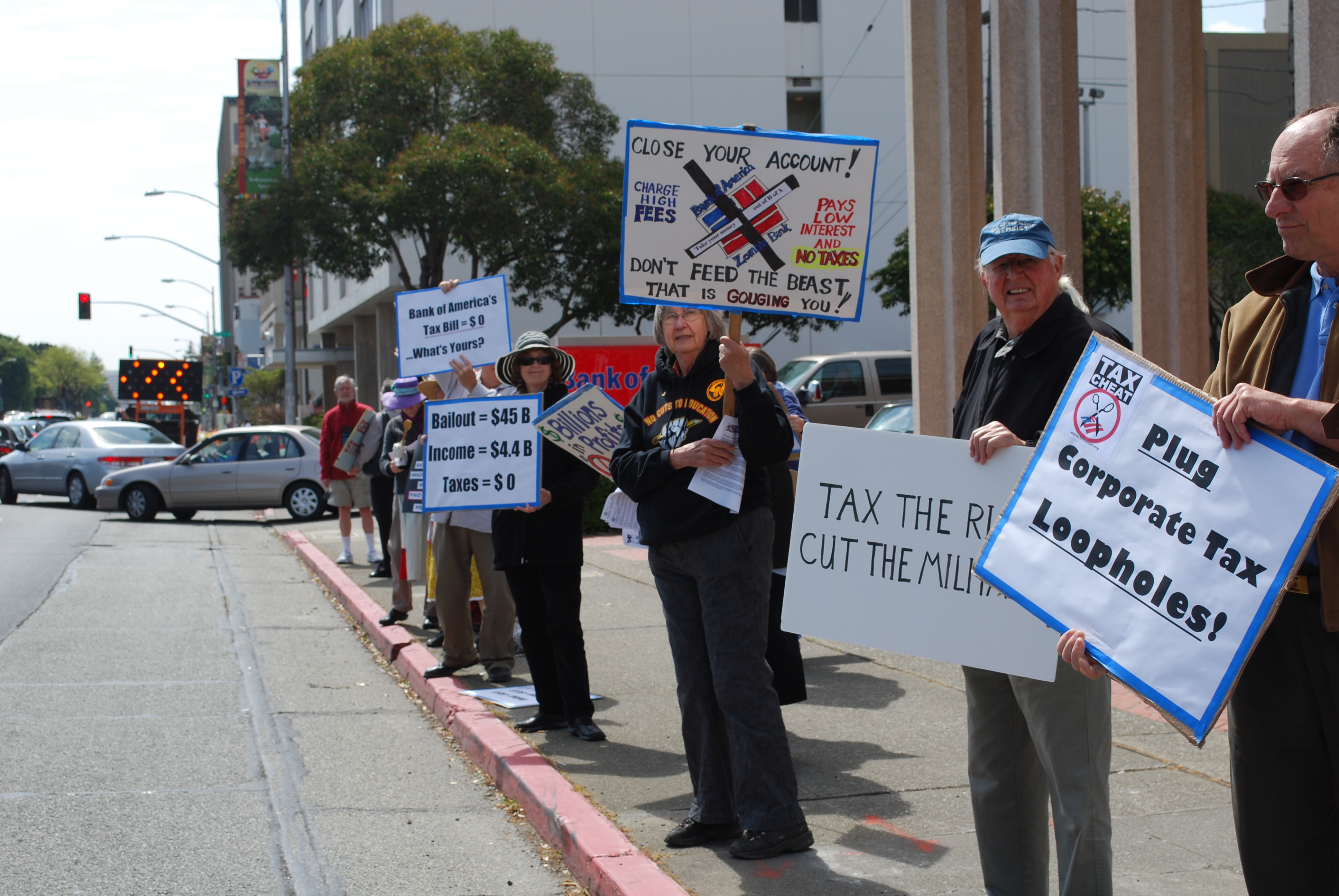 Demonstrators in front of a branch of Bank America in San Mateo said they want BofA to pay the United States back for the taxes it avoided paying through tax loopholes and creative accounting. They want that money to be used for education, health care, veterans benefits, child care, libraries, and other human services that are being cut from federal and state budgets.