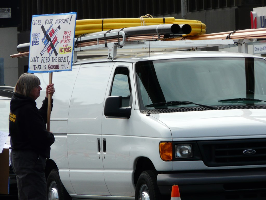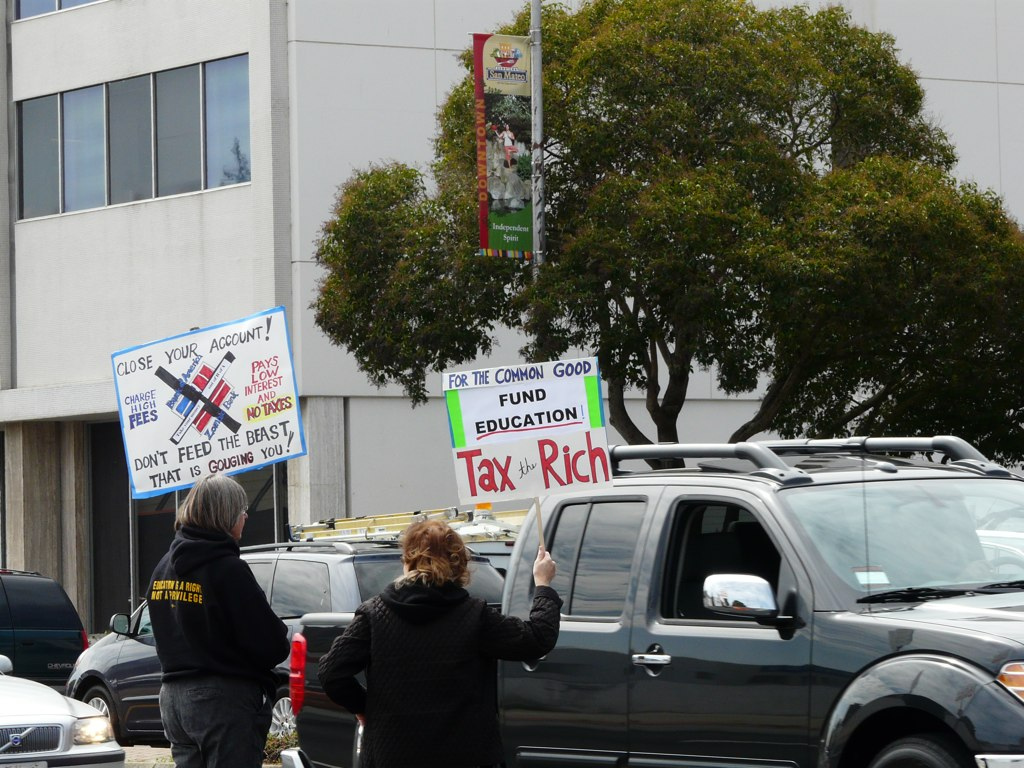 Protesters today said Bank of America made tens of billions in pure profit last year and got more than 3 billion dollars back from the government after taxes. How do they do it? “B of A stashes its money in offshore accounts. That is money that rightly belongs to the American people,” explained a member of Take Back Democracy of San Mateo.