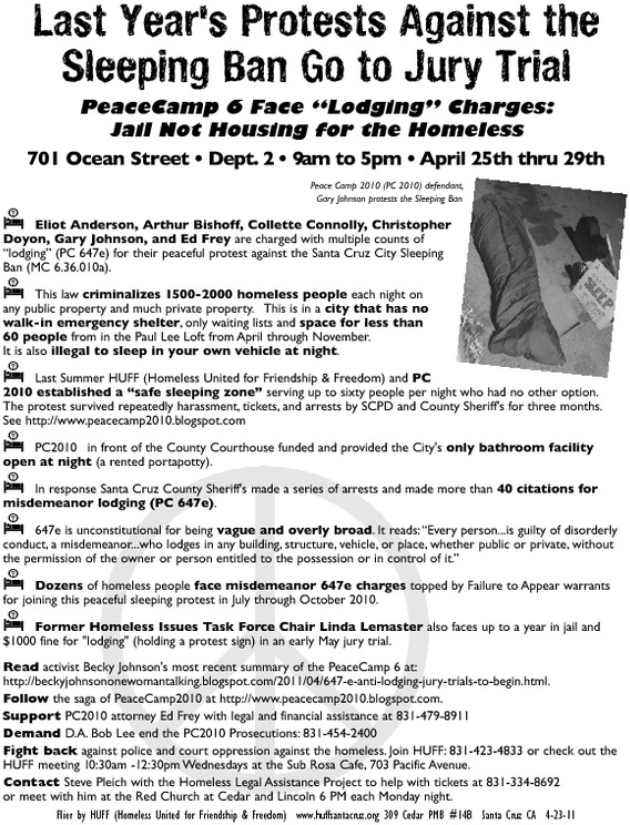 +++ Last Summer HUFF (Homeless United for Friendship & Freedom) and Peace Camp 2010 (PC 2010) established a “safe sleeping zone” serving up to sixty people per night who had no other option. The protest survived repeatedly harassment, tickets, and arrests by SCPD and County Sheriff's for three months. (See http://www.peacecamp2010.blogspot.com/ .)
