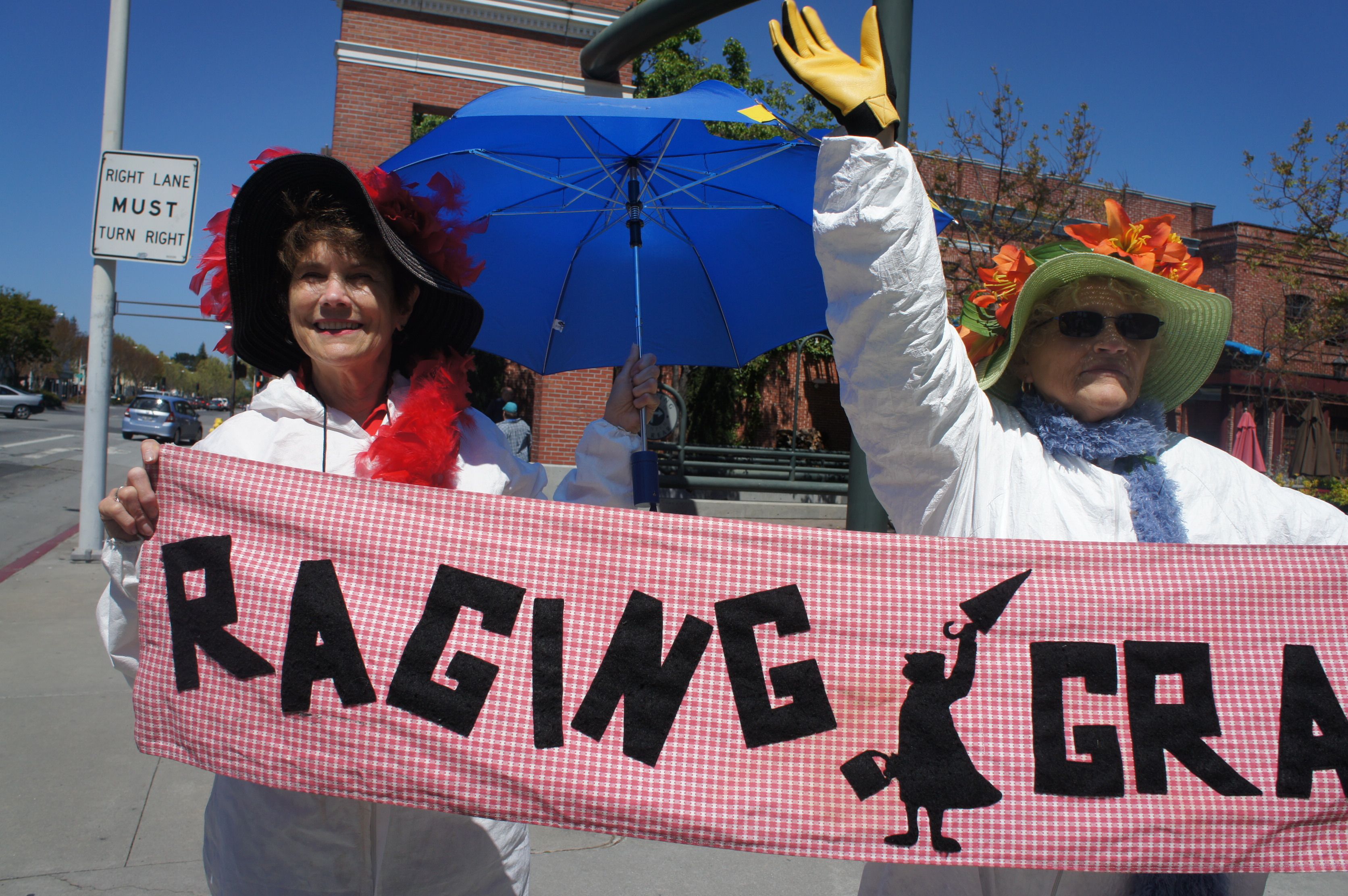 As of today, it has been a quarter century since the Chernobyl nuclear disaster. The Raging Grannies, in solidarity with Abalone Alliance in San Francisco and other activists around the world, remembered the victims of that man-made catastrophe. They demonstrated against nuclear energy along the El Camino Real in Menlo Park, California, and performed for a lunch crowd in front of nearby Cafe Borrone.