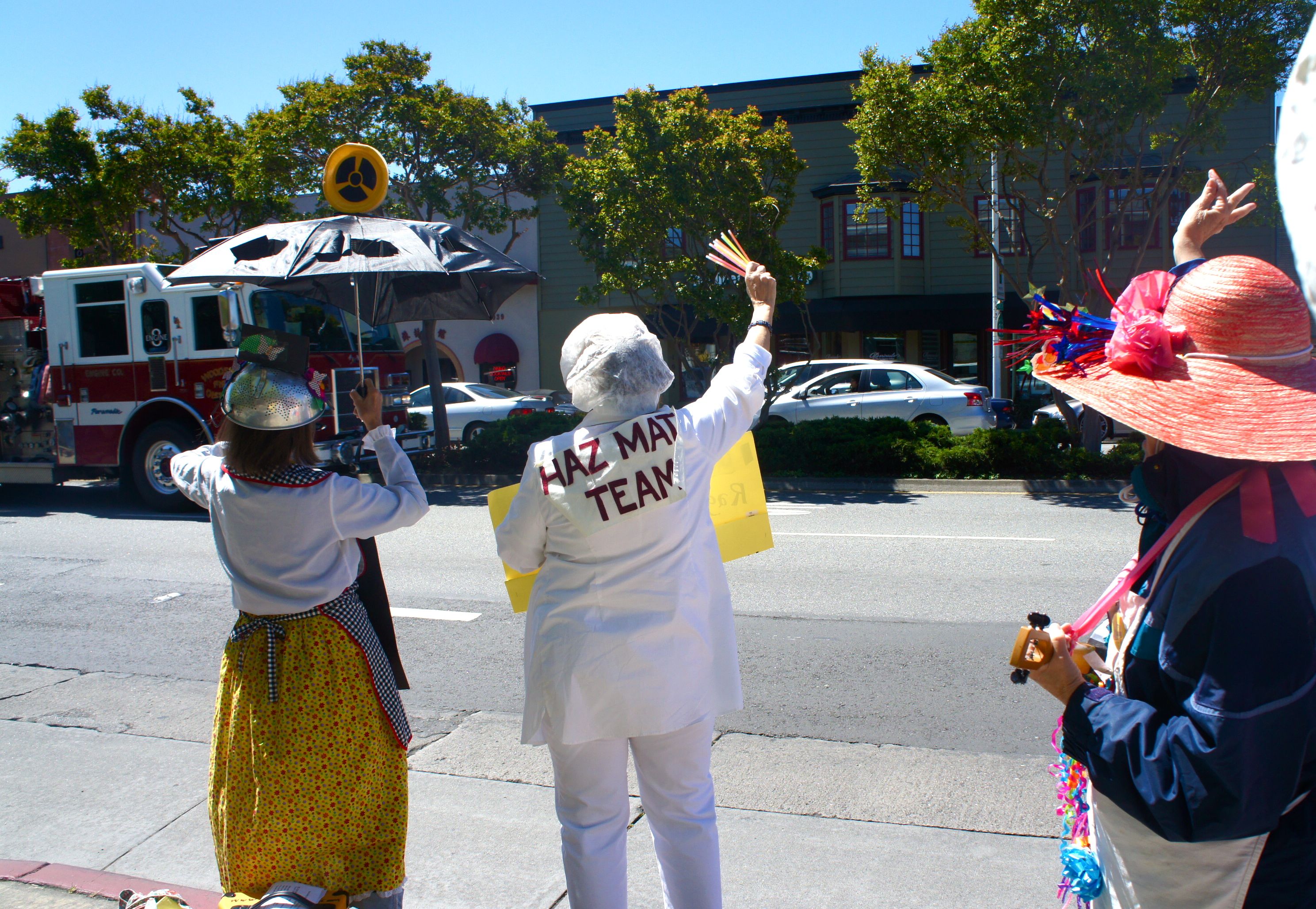Activist older women performed street theater called: “New Trends in Nuclear Radiation Wear for SF Bay Area Fashionistas” with a catwalk of “nuclear radiation protection wear”. The theme of their vignette: nuclear "protection" wear doesn’t protect anything!