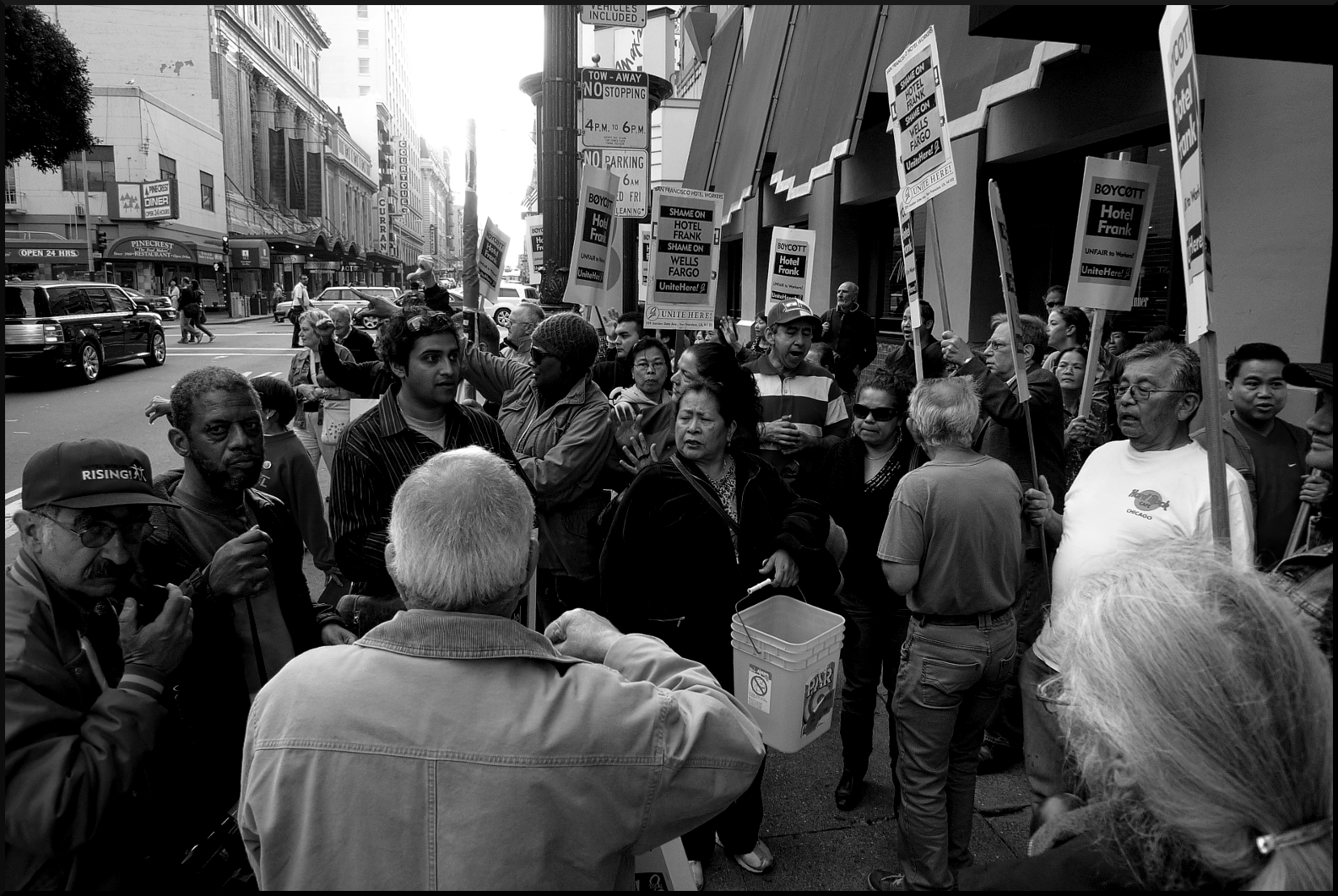 Workers at Hotel Frank have been under attack since Wells Fargo foreclosed on the hotel in May, 2010. Wells Fargo brought in a new management company, Provenance, which refuses to recognize the UNITE HERE Local 2 contract, has not paid anything for medical coverage or pensions, has dangerously increased the workload for room cleaners and other workers, and has fired Union organizers.