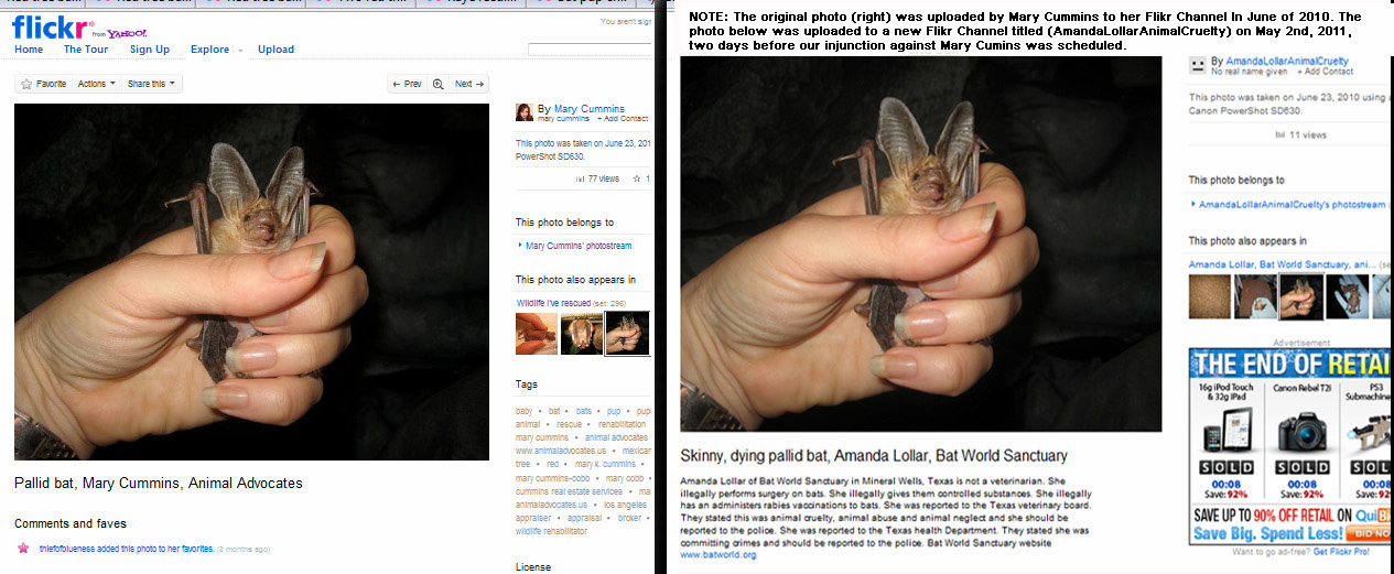 An injunction was scheduled on May 4th, 2011, to force Mary Cummins to remove the defamatory statements she has made about Bat World Sanctuary and Amanda Lollar from the internet. Approximately three days before the injunction, numerous new pages containing false and damaging statements appeared on dozens of internet sites, including facebook, indybay, twitter, myspace, care2 and more. Copyrighted videos from Amanda Lollar’s most recent book were illegally downloaded and altered in an attempt to display cruelty, then uploaded to youtube. Other recent defamatory items include photos Mary Cummins took without permission while interning at Bat World Sanctuary. Read more about Mary Cummins here.