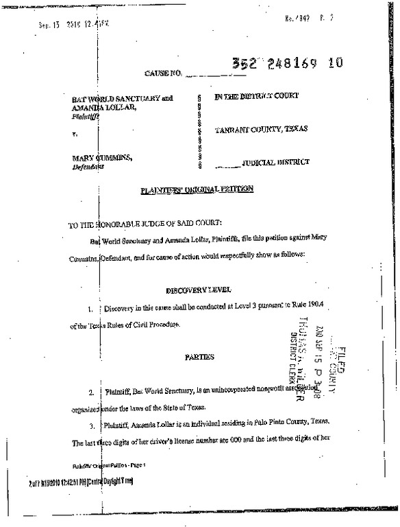 Evidence, exhibits, motions, affidavits from Mary Cummins in the Bat World Sanctuary/Amanda Lollar lawsuit. She proves that Bat World's allegations are unfounded.