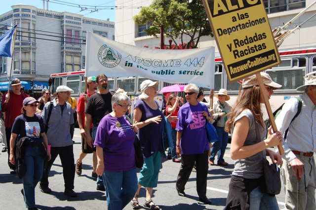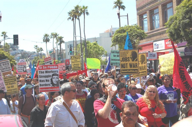 We gathered in the Mission and marched to cheers all the way down Mission Street to Civic Center for a rally. Then Code Pink began their march to Sacramento, joining teachers May 9 in a tent city.