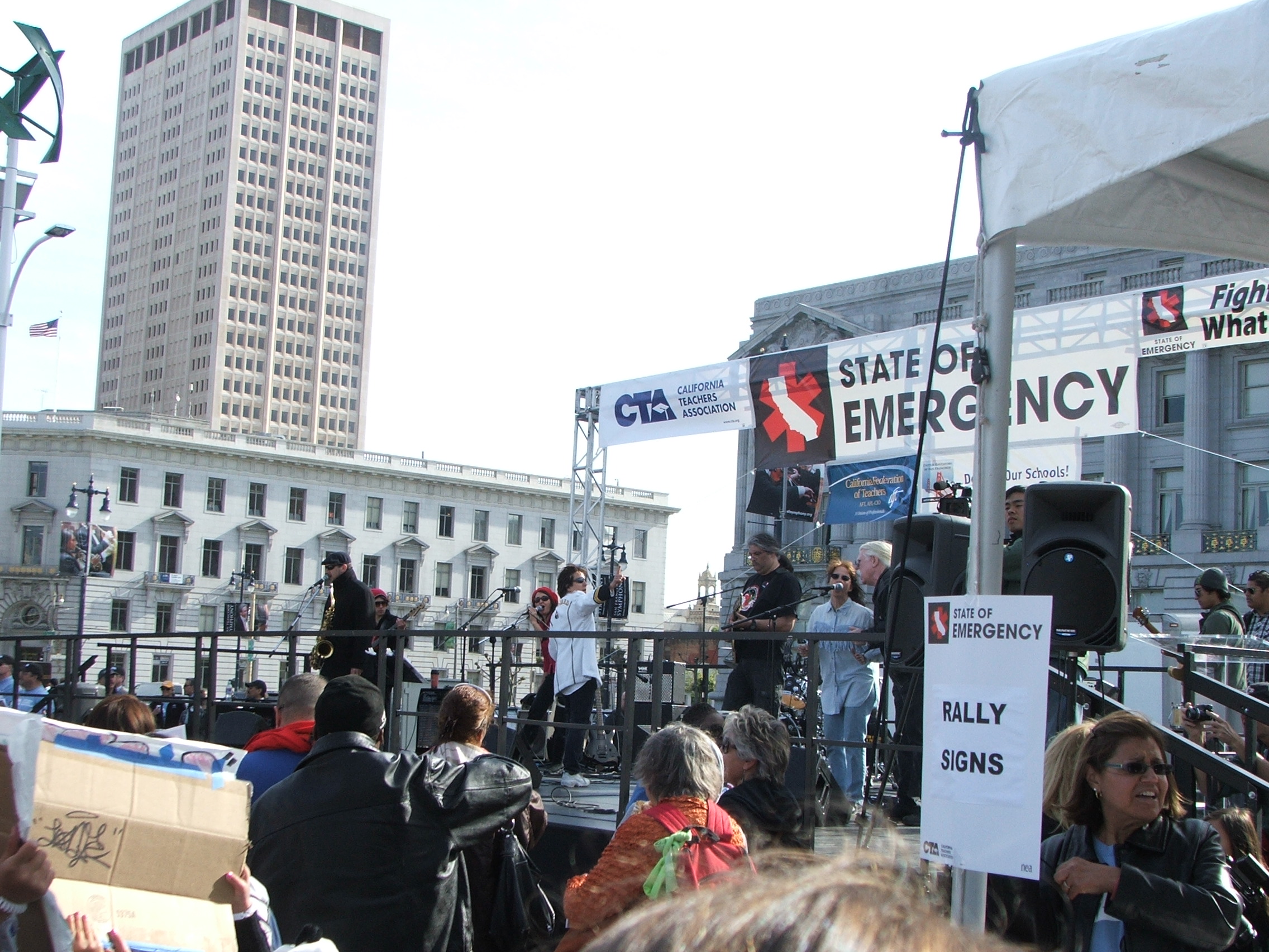 The rally was sponsored by the CTA (California Teachers Association), PTA (Parent Teachers Association), student groups, and others. Labor unions and community organizations were also represented among the diverse crowd.
