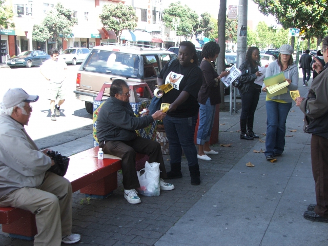Following the press conference, the coalition broke into two groups: one distributed leaflets about the upcoming protest on BART trains, while the other gave out leaflets and put up posters in the community.