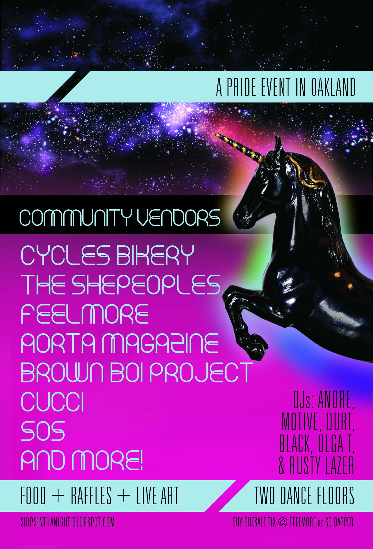 That's right fam bam, Ships In The Night is bringing a June Pride celebration to Oakland. Get ready for a whirlwind of musical performances, star DJs, live art, finger-licking good homemade food, a display of fascinating community resources and oh-so-much more debauchery. And we have no corporate sponsors. Bringing this to you i n d e p e n d e n t..ly so ♥
