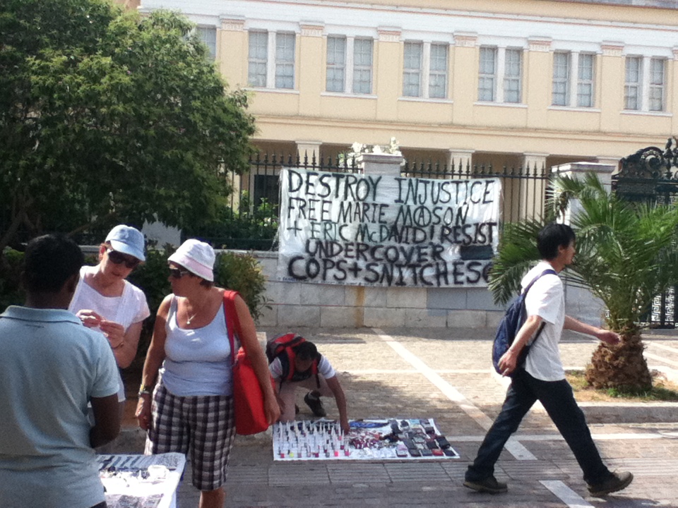Banners in Athens, Greece in support of Marie Mason and Eric Mcdavid!