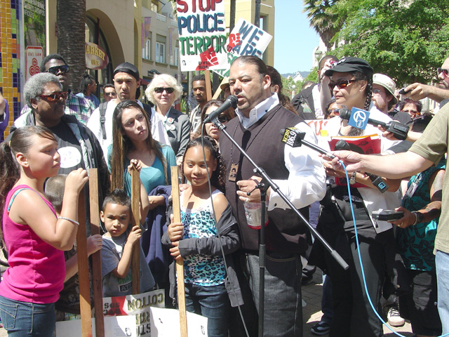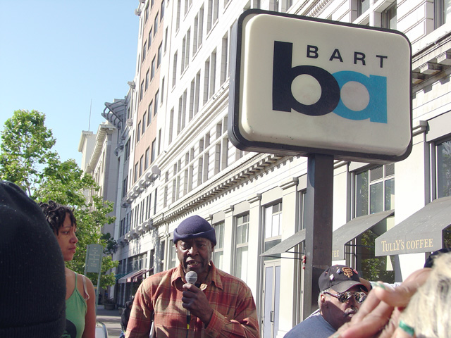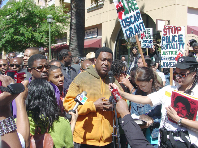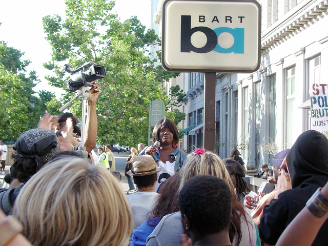 [Pictured above: at Grant/Fruitvale BART Station, Jack Bryson speaks with Oscar Grant's daughter Tatiana in front of him]
