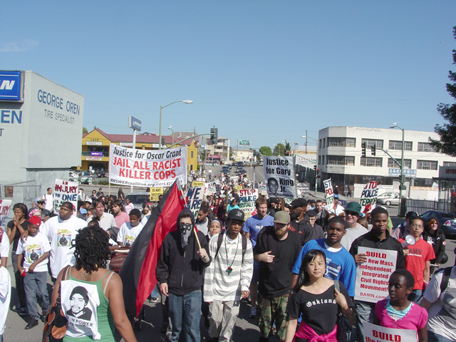 On Sunday, June 12th, hours before Johannes Mehserle was set to be released from Los Angeles County Jail for having killed Oscar Grant by shooting him in the back, hundreds rallied in Oakland at Fruitvale BART station, the scene of the crime, marched up International Boulevard, and again rallied downtown at 14th & Broadway to protest Mehserle's lenient conviction, sentencing, and time served. Today there was a protest at the Los Angeles County Superior Court, followed by a march to the U.S. District Court to demand that federal civil rights charges be brought against Mehserle and the other BART officers who abused Oscar Grant and his friends on January 1st, 2009. Mehserle served eleven months of a two-year sentence for Involuntary Manslaughter and was released just after midnight on June 13th.