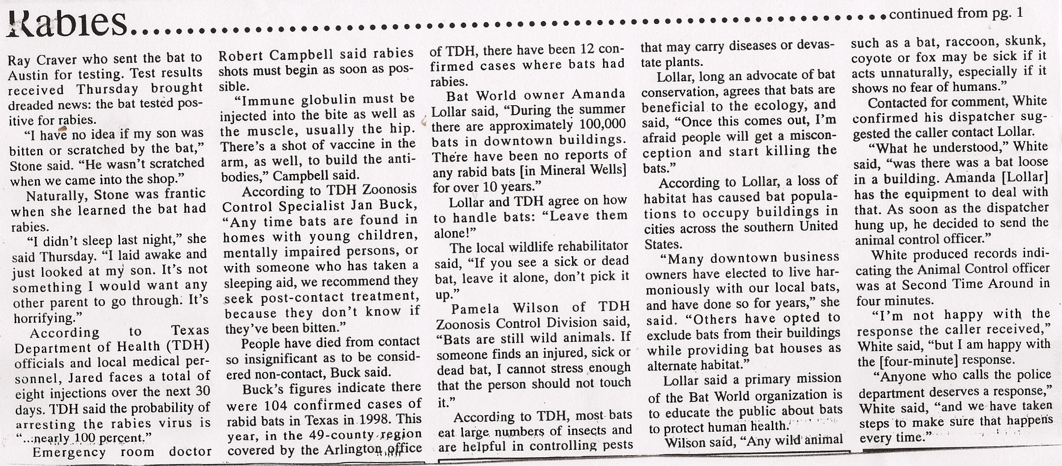 Between June 20 and October 16 of 1993, 23 dead and dying bats were collected from roosts in four adjacent buildings in downtown Mineral Wells, Texas by Amanda Lollar. 17 of the 23 bats tested positive for rabies. That is 72% of the dead and dying bats. These dead rabid bats were the subject of a journal article on rabies. Texas is noted as the bat rabies capitol of the US. From 1995 to 2009 six people died of rabies in Texas. They were all the bat strain of rabies. One in four people who died of rabies in the US in 2009 was in Texas.