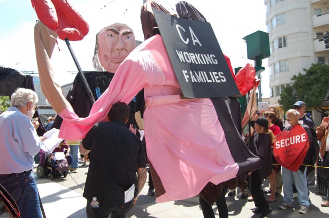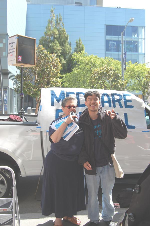 Hundreds of us confronted the AHIP (America’s Health Insurance Plans) convention, June 16 at Moscone Center to give them a message, “Keep your hands off Medicare!” AHIP represents the insurance companies, those corporations who deny care whenever possible while raising your premiums. AHIP speakers included presidential candidate Tim Pawlenty and Senator Tom Daschle who oppose proposals that remove the health insurance industry from our healthcare system and support the Republican’s plans for Medicare vouchers and block grant Medicaid. The overhead costs under current insurance-dominated health care waste 30 cents of every dollar. Medicare has an overhead cost of about .03 cents on the dollar.