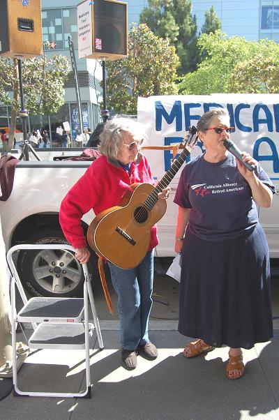 Our speakers joined a broad coalition of labor, community activist organizations, teachers, nurses, physicians, and messages from supportive politicians. Reverend Israel Alvaran, UNITE/HERE Local 2 passionately spoke to the immorality of the insurance industry; “Making money off of people’s health is immoral!” Karen Smulevitz, CARA (California Assoc.. of Retired Americans, told about a woman fighting kidney cancer whose doctor prescribed a new oral chemo medication. Yet, the medication would cost $2,400 a month. DeAnn McEwen, CAN (California Nurses Assn.), and National Nurses Organizing Committee warned us that those insurances people inside Moscone plot to put profits over people. “Blue Shield is No Shield, and Blue Cross is Double Cross!” Kim Alvarenga, District Director for Tom Ammiano, read a message from Assemblymember Ammiano reminding us of the need to work in coalitions to assure everyone access to healthcare. SB 810 would bring affordable healthcare to every resident in California and that includes undocumented workers and families. Beverly Ng Senior District Representative for Senator Mark Leno said it is our job here in California to lead the way for health care, that there is a difference in health care and health insurance! Glenda Hope brought messages of support from Marin Representative Lynn Woolsey. Long-time fighter for Single Payer health care Don Bechler, Single Payer Now, received enormous cheers for his years of organizing. Greg Brockbank, Health Care for All called Health care a civil right and the organization has gathered tens of thousands of signatures for AB 810. Raging Grannies and Faith Petric led us in familiar songs with different words: “We love our Medicare – Don’t Privatize